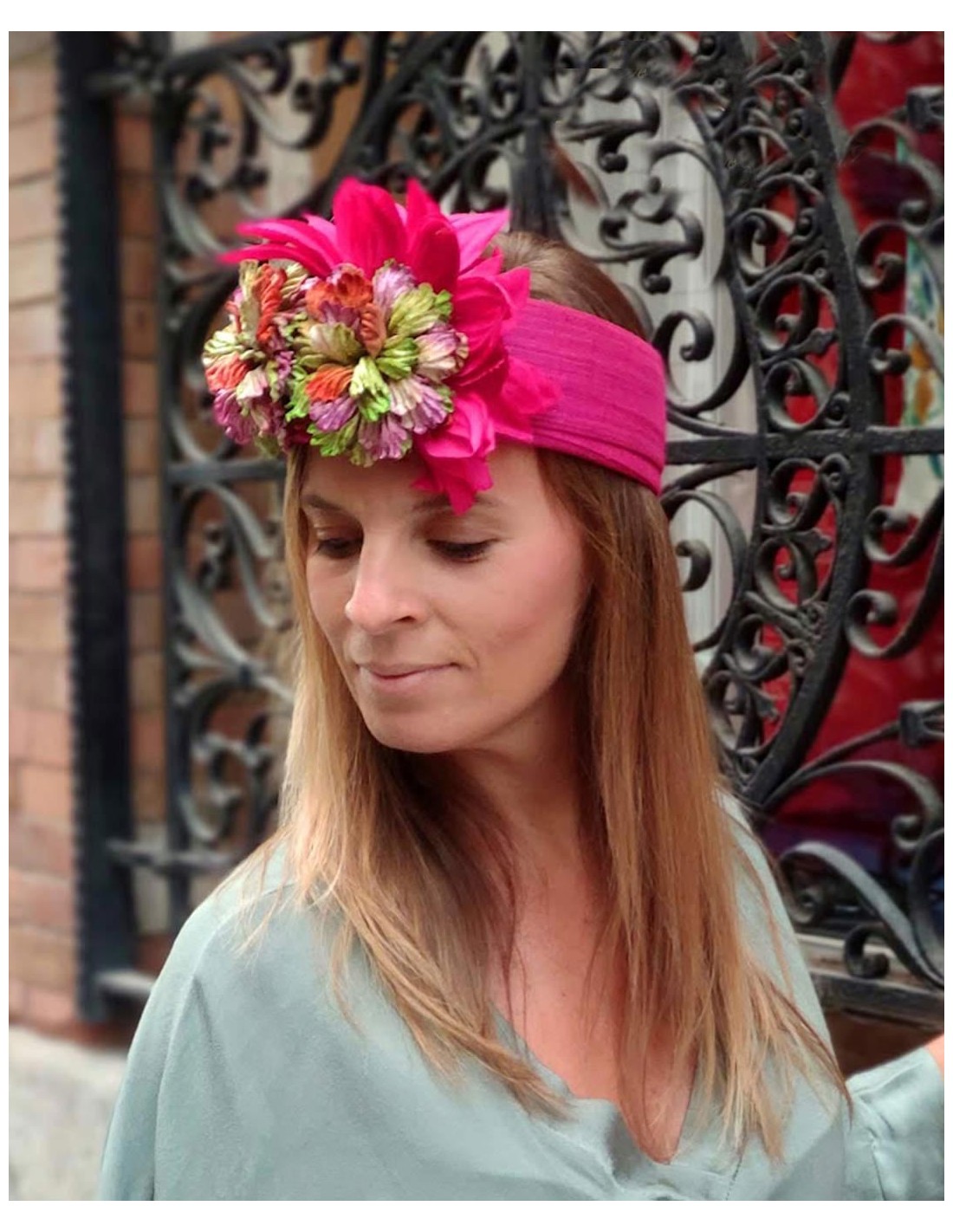This turban in sinamay silk with velvety flowers in bougainvillea tones is ideal for a daytime event. You will get that touch of light to your look and you will surprise with the result. Dare to add a complement like this and combine it with your favorite garment to be the perfect guest.