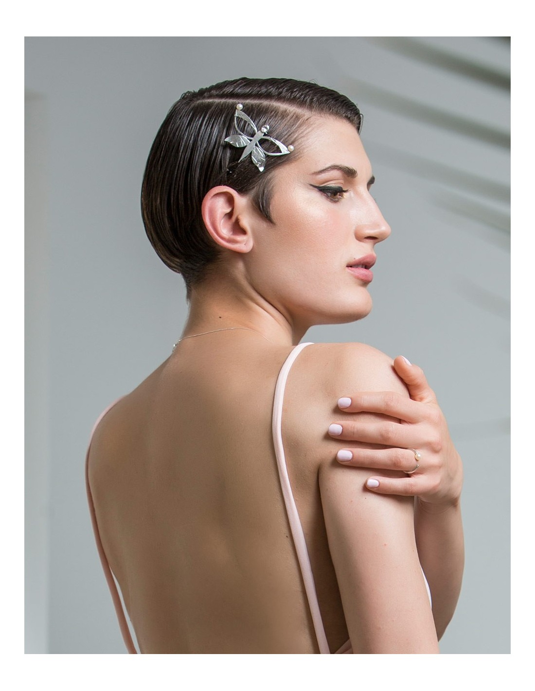 Silver butterfly headdress with quartz and pearls by Eme Jewels at INVITADISIMA.