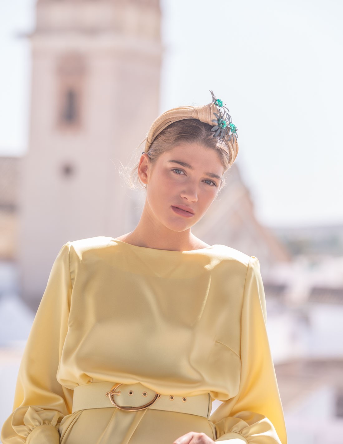 Beautiful guest headband with natural silk fabric in beige with blue flowers and jade stones. An ideal complement for any special occasion such as weddings, baptisms and communions, you will be the perfect guest!