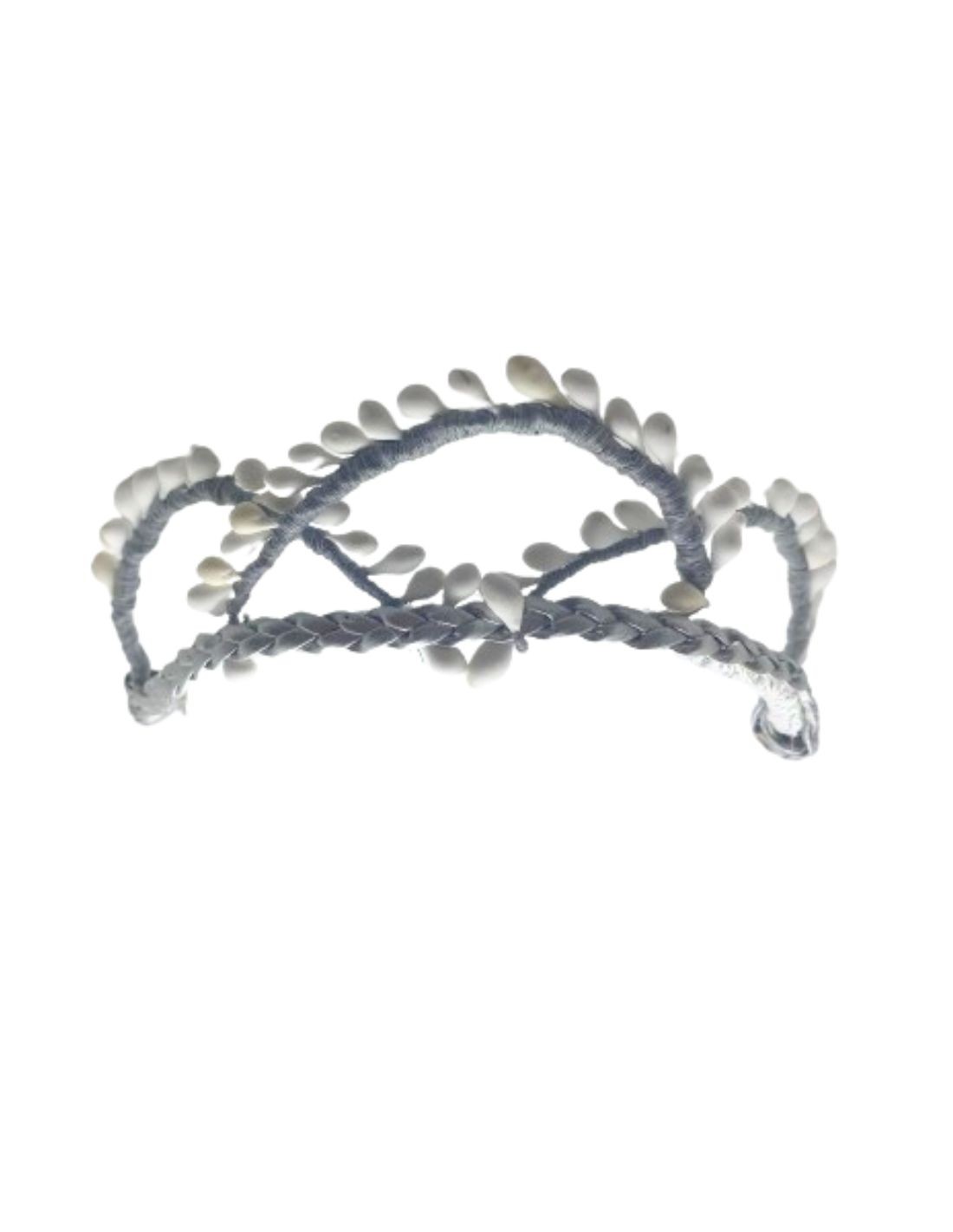 This bridal tiara is handmade on an iridescent coloured base combined with silver plaited braiding adorned with white pistils. It measures 25 cm long and 4 cm wide arches.