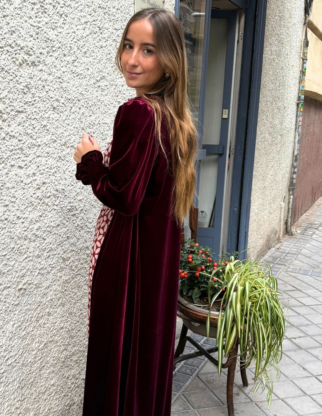 Complete your guest look with accessories that make the difference and elevate your look to the highest level, with this guest kimono. A kimono made of velvet fabric in maroon color, with details of gathers included in the cuffs of the sleeves. The ideal complement for any guest look, especially for autumn/winter seasons.