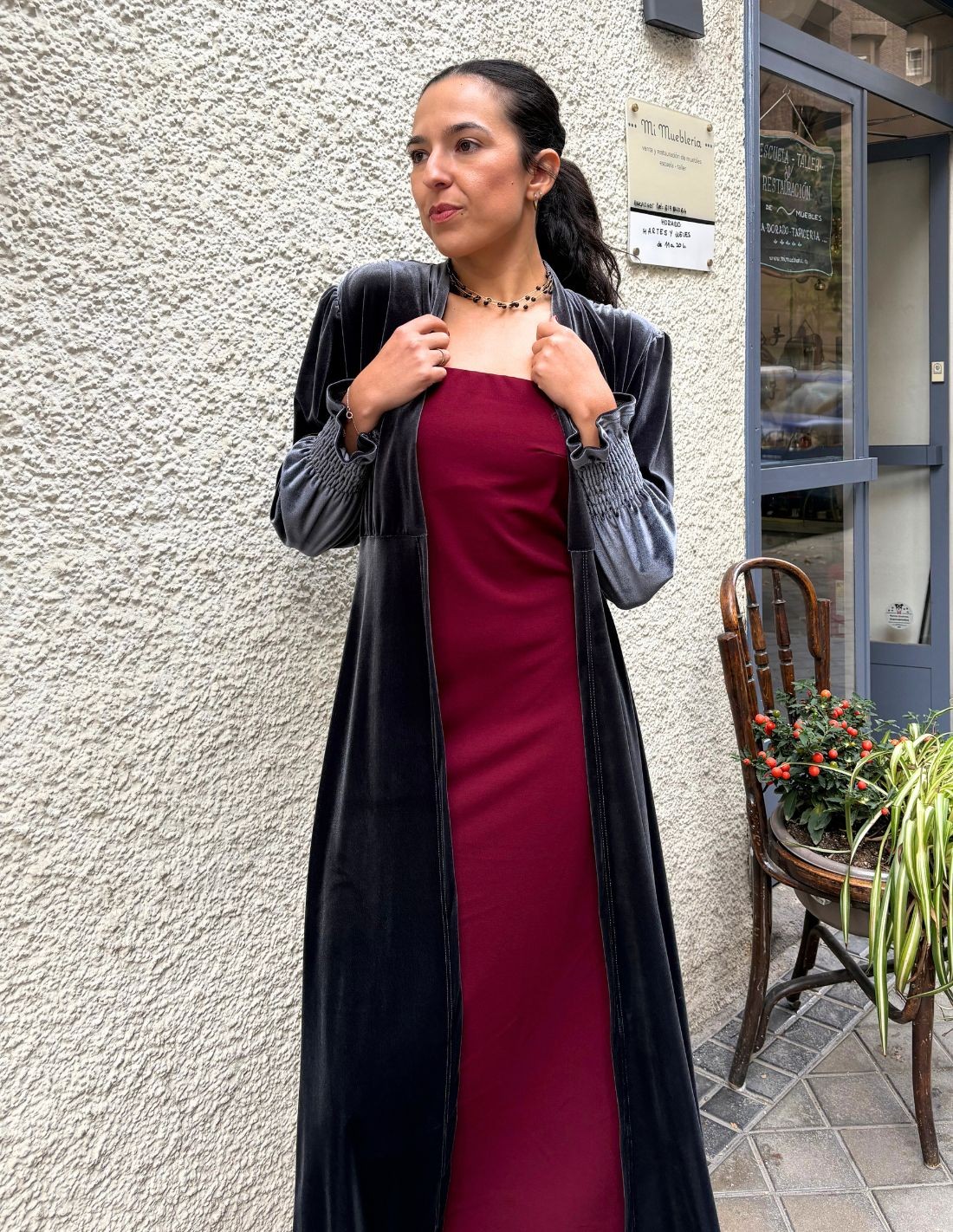 This velvet guest kimono is a versatile garment designed to enhance any look. Designed with empire cut and straight fall, which provides a very flattering and elegant silhouette. The sleeves are finished with elastic at the wrist. A comfortable and sophisticated piece that you can wear both in formal events and in more casual looks. Its gray velvet fabric, makes it a must for your fall and winter events, either to combine with a midi dress, a set, suit or even a more risky styling.