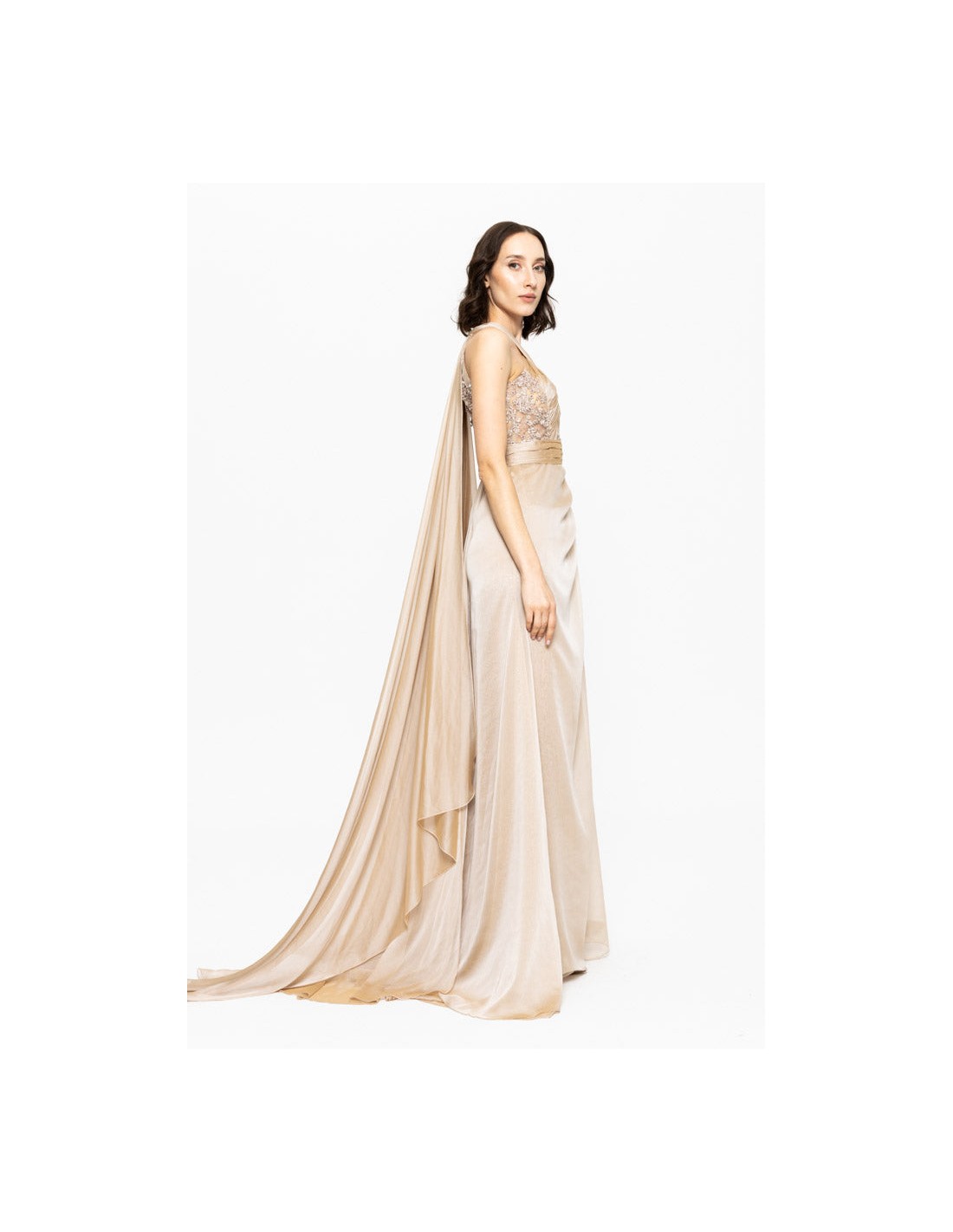 This dazzling beige long ball gown with halter neckline and front slit features a sophisticated and modern design.