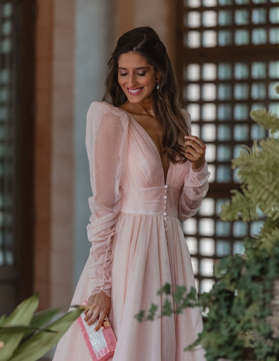 This long party dress is available in powder pink and mauve, with puffed sleeves and delicate shiny details that add elegance and sophistication. This guest dress features a V-neckline and buttons down the front, enhancing the figure with a romantic and feminine style.