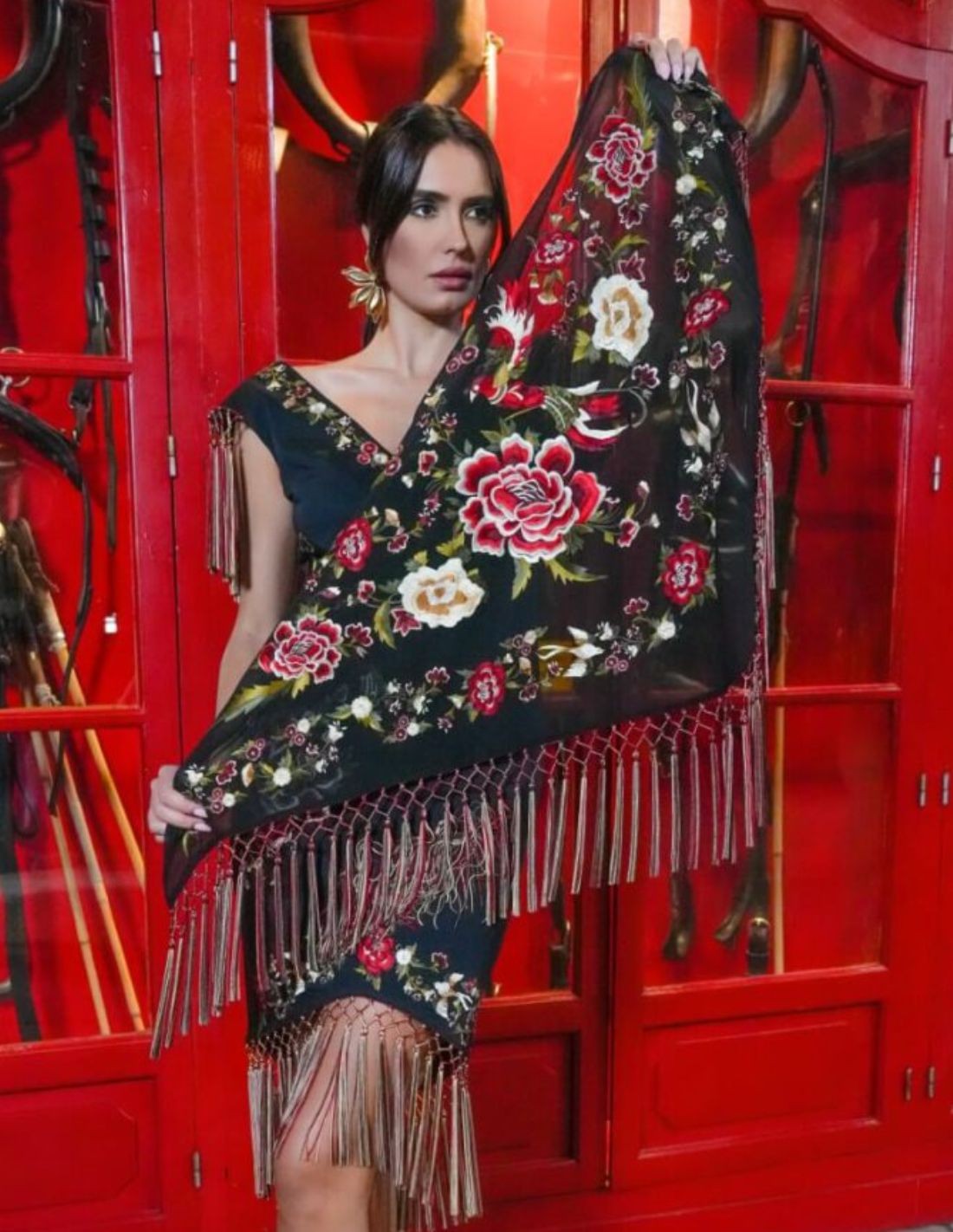 The black embroidered shawl with multicolored bangs is a sophisticated accessory that adds a unique touch to your flamenco dress. Its floral embroidery stands out against the dark background, offering an elegant contrast and full of detail. The bangs, long and dynamic, accompany every movement with grace and naturalness.