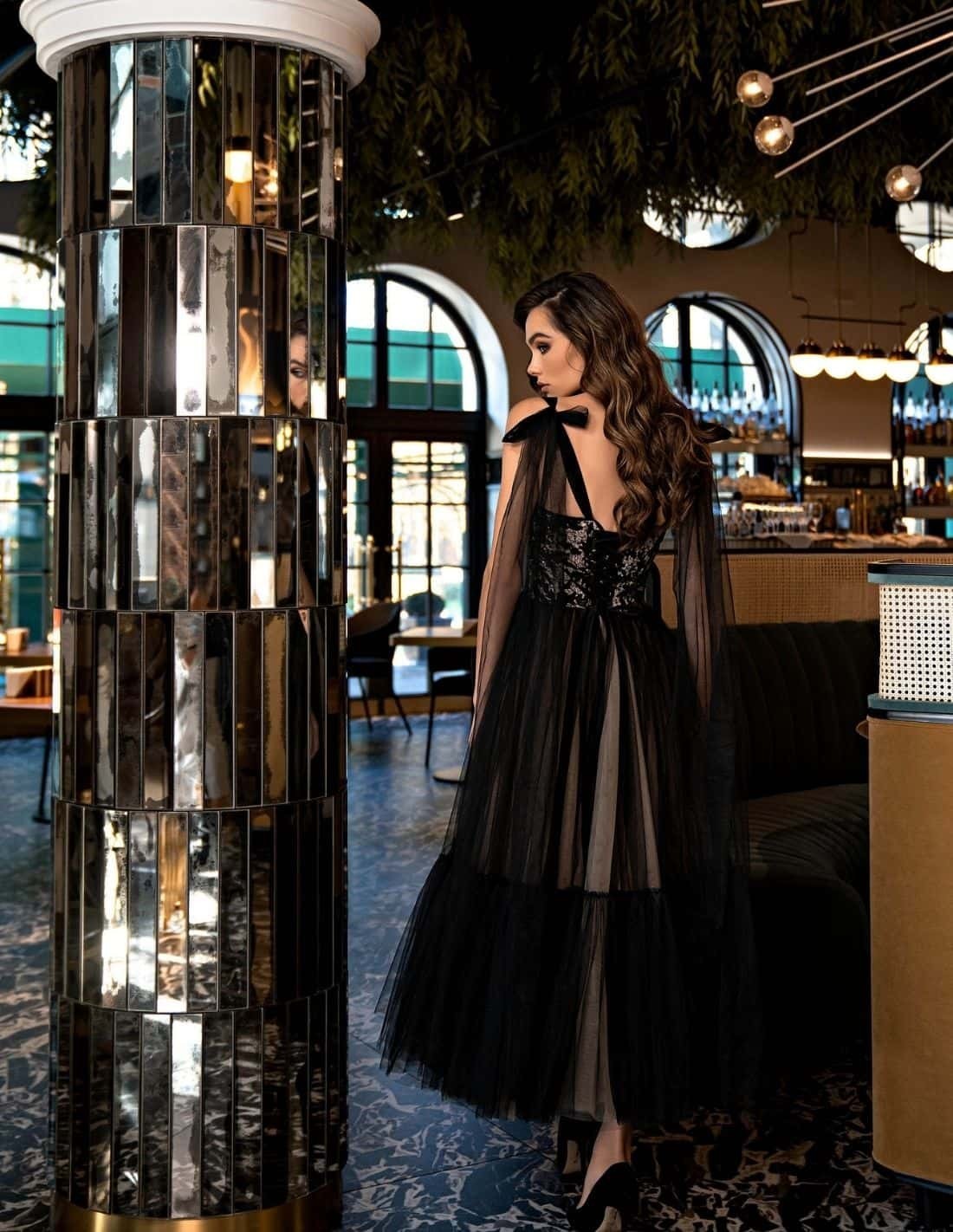 This guest dress is made of excellent tulle and lace bodice available in black or powder pink. Its design has a sweetheart neckline with tulle straps and a very flattering midi skirt. Closes at the back with a bow and an invisible zipper.