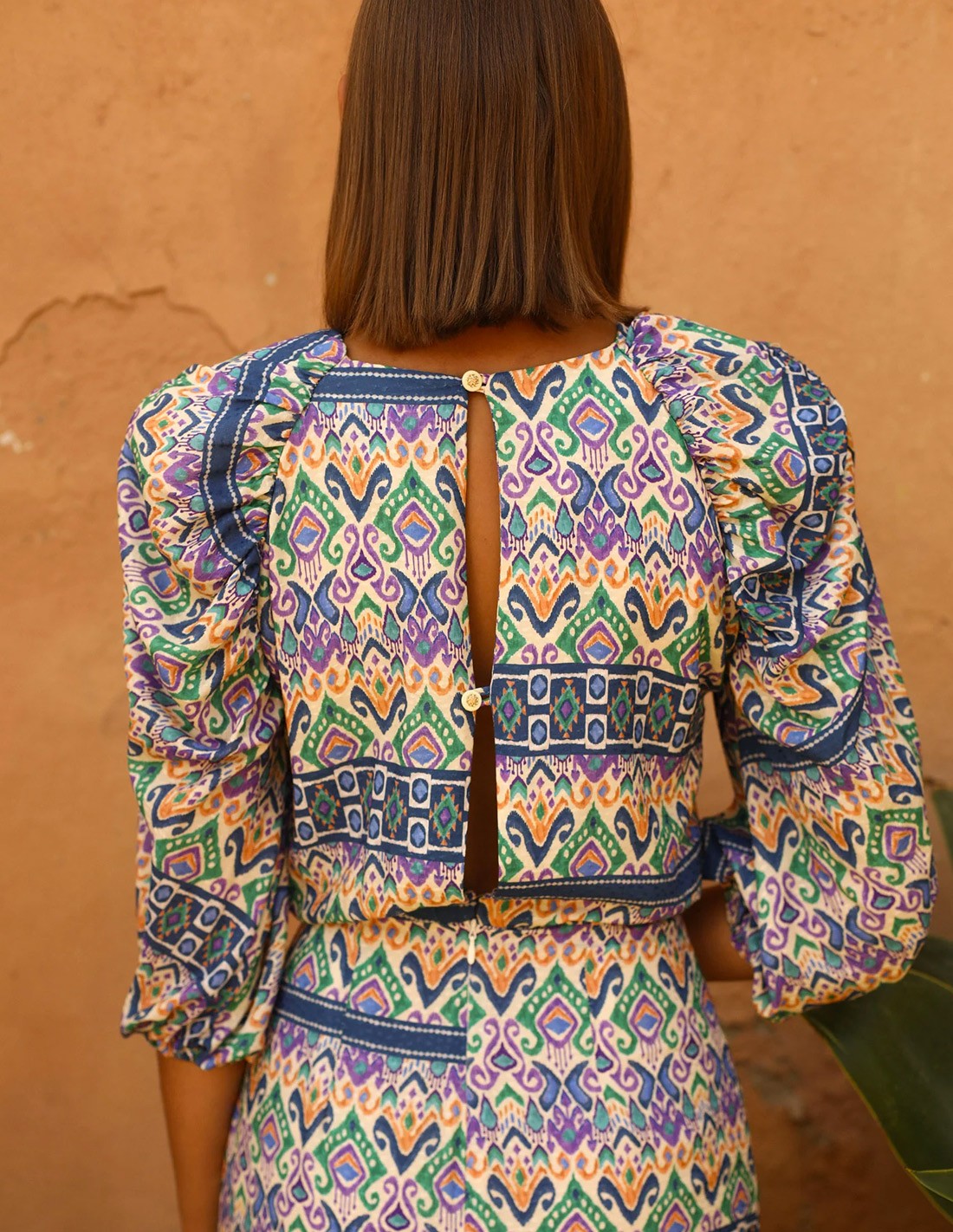 An original and very flattering design to sweep your next event. Made in a fluid fabric perfect for this spring season. It incorporates a box neckline and puffed sleeves and French cut ranglan. It is cut at the waist and from there, the skirt starts. In its design, it also adds a back with an opening that closes with buttons. A comfortable design with which to succeed in day or evening events.