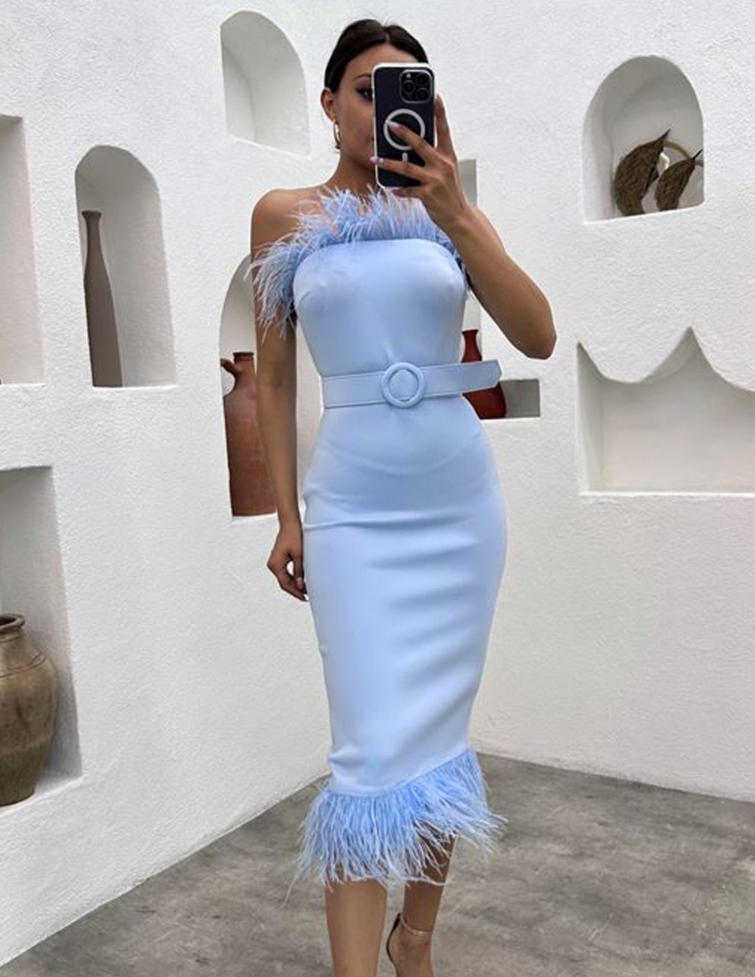 Midi party dress with feather detail and belt