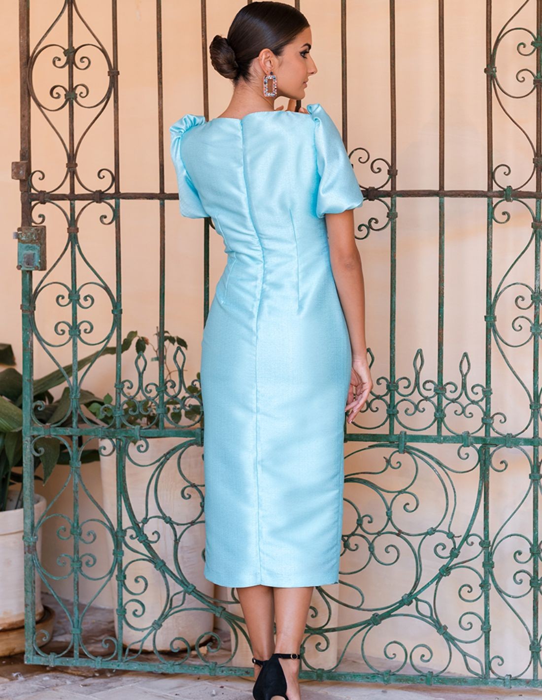 Midi party dress with asymmetric neckline and short lantern sleeves for guests at daytime events such as mothers of communion, christenings, or daytime weddings.