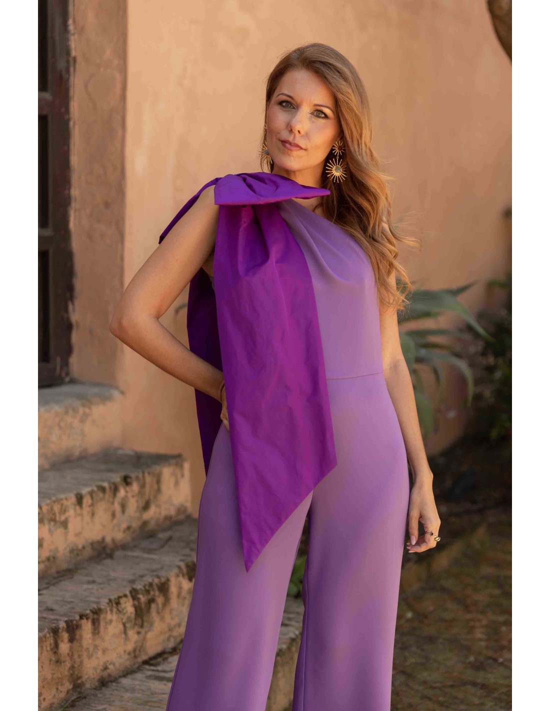 This elegant jumpsuit is made from an ideal plain crepe with a very flattering purple taffeta and features an asymmetric neckline with a waist cut, lacing on the right shoulder and a zip fastening on the left side. It features an asymmetric neckline cut at the waist, a bow on the right shoulder and a zip fastening on the left side.