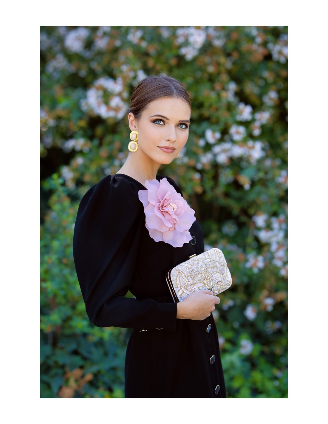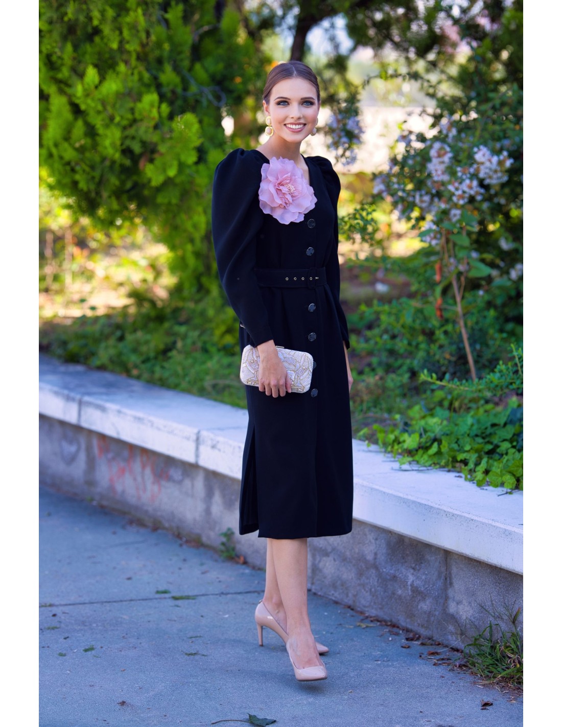 This midi party dress with flower detail is ideal for a perfect autumn guest. Very flattering, and thanks to its color, perfect for an evening event such as a wedding or party. Stylizes the figure thanks to the belt lined with the same fabric, and is very flattering for all body types. It incorporates jewel buttons on the front and a pink flower brooch that you can remove or put on depending on the look. It is lined and its sleeves are detachable. Undoubtedly, a timeless design that you will not want to take off.