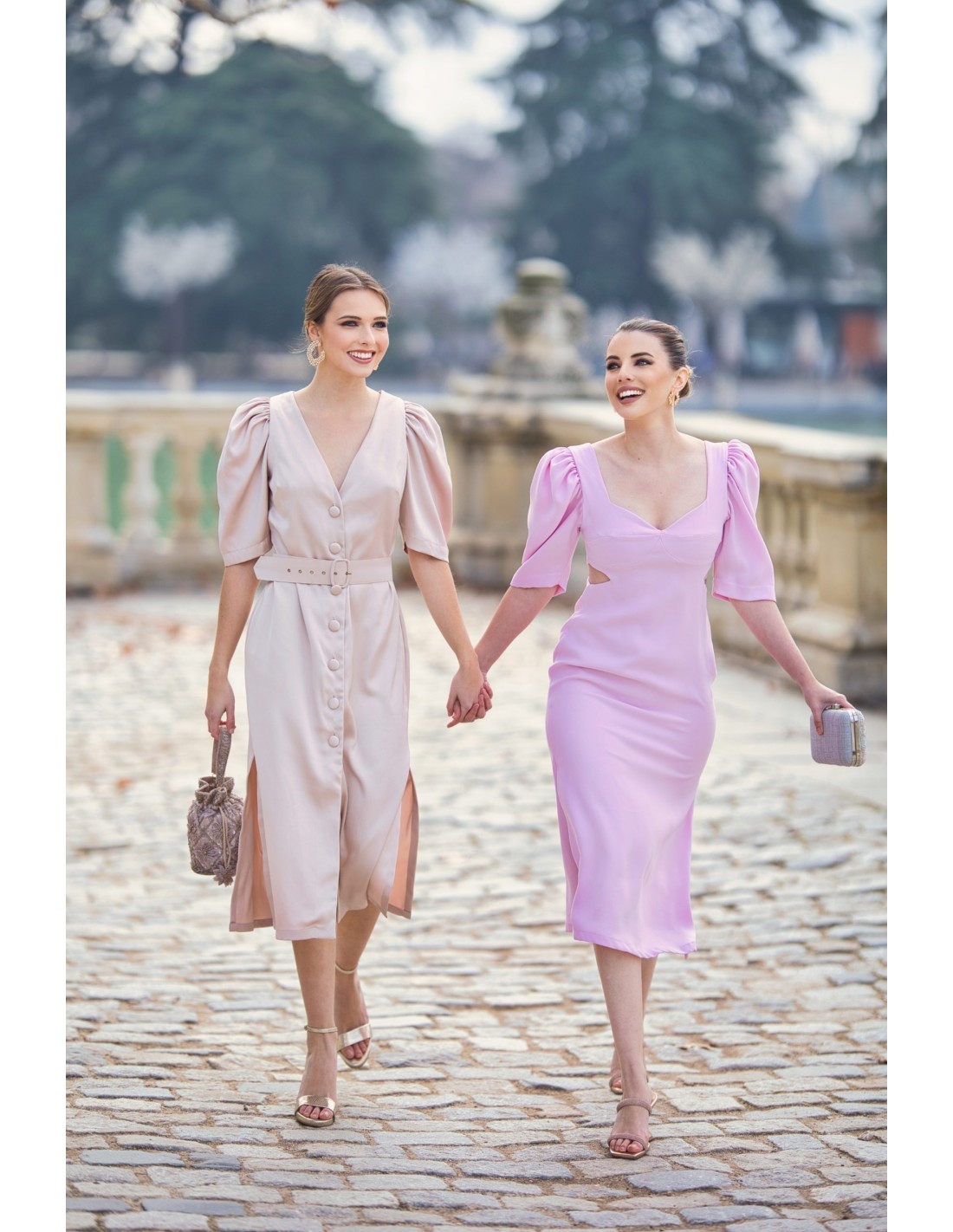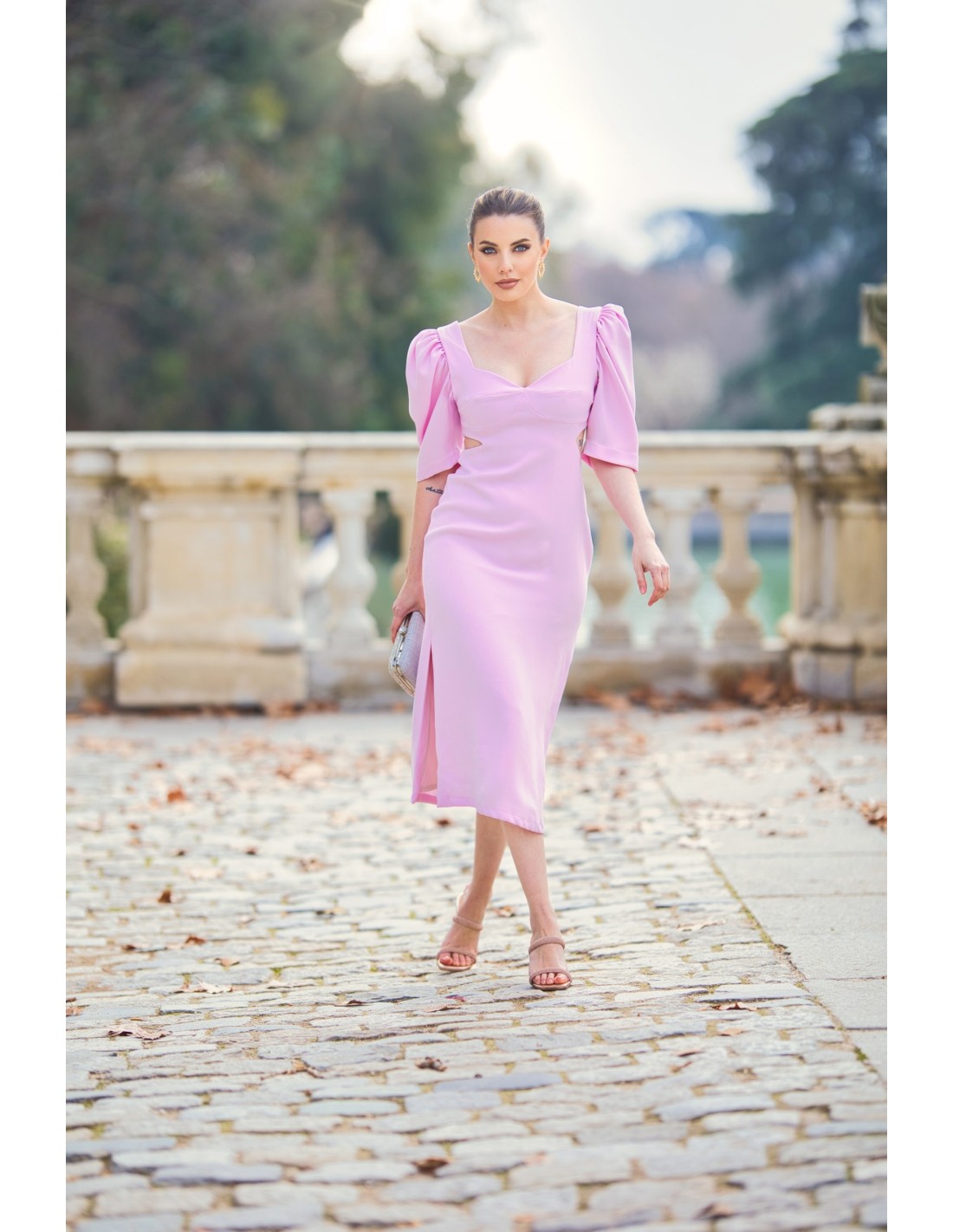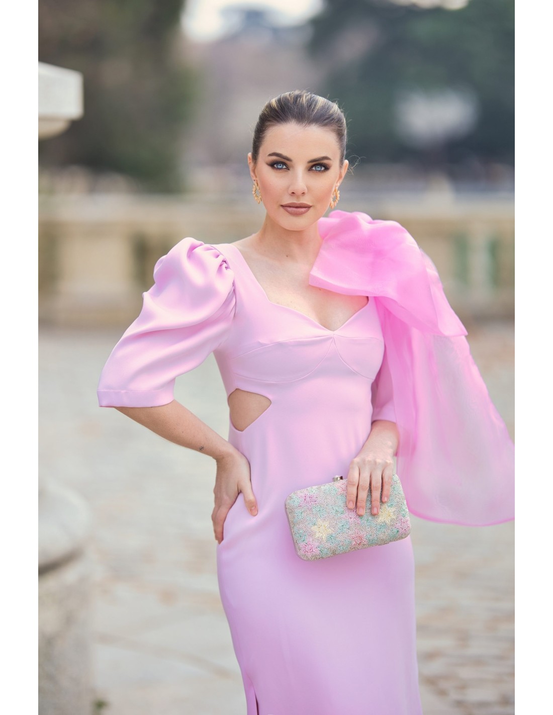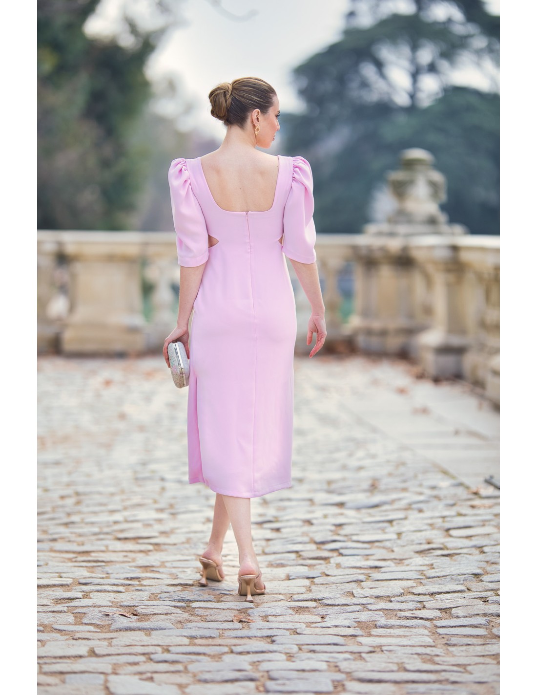 A midi dress for guest with cut-out and maxi bow in pink, ideal for a day event. Super elegant and sophisticated with organza bow that you can place on the shoulder. It also has detachable sleeves so you can create different looks for different occasions. It is a versatile dress that looks great and will make you shine. Designed with sweetheart neckline and a subtle cut out on the sides. Inner lining.