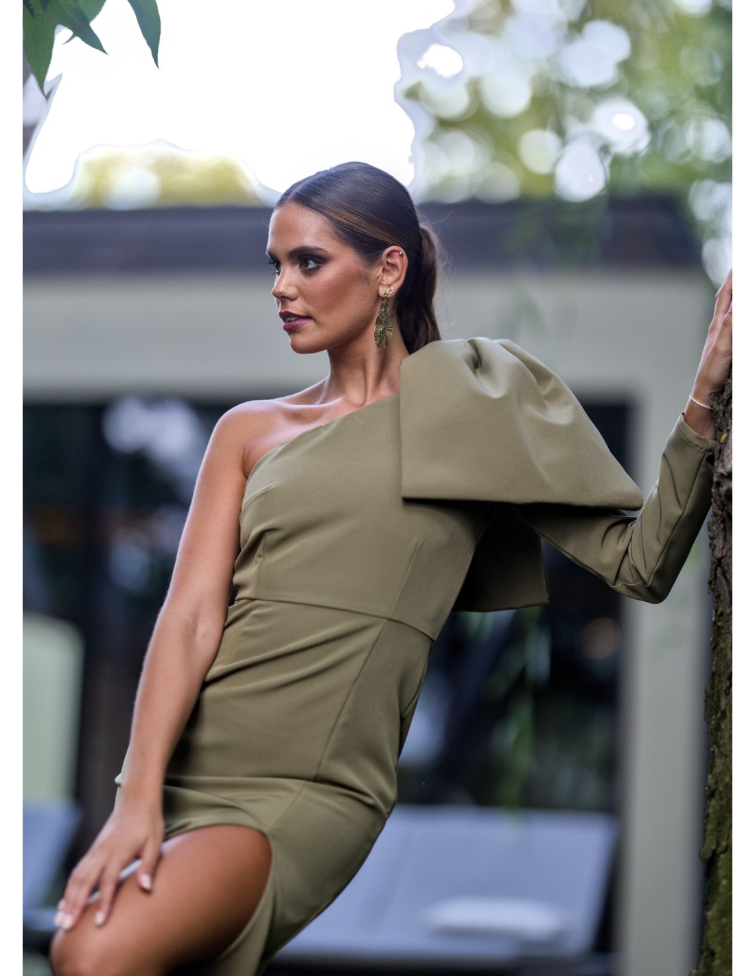 Be the best dressed at your next event with this green midi dress. Featuring a crossover neckline leaving one shoulder exposed, long sleeves, plunging slit in the front and invisible zipper on the side of the dress, with a lush bow detail. Ideal for an afternoon or evening event for spring or summer.