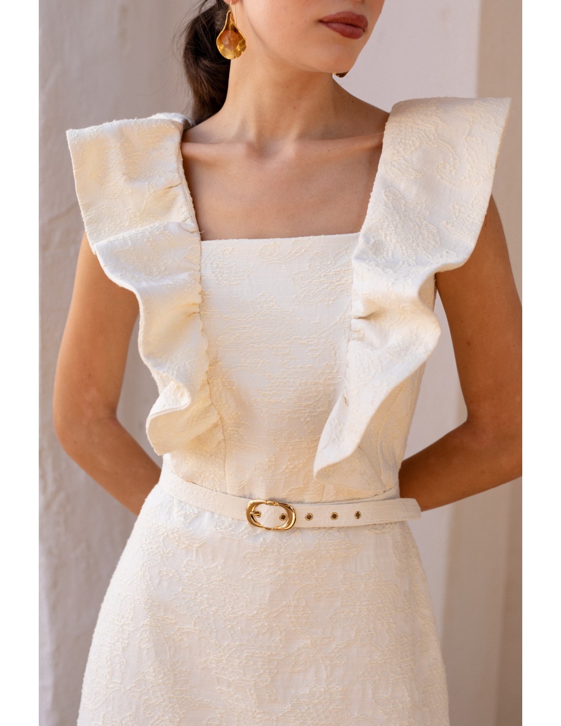 This elegant white floral print midi guest dress is the perfect choice for any special event. With a fresh and sophisticated design, the dress stands out for its midi cut, which offers a flattering and comfortable fit. The delicate flower print adds a romantic and modern touch, ideal for weddings, dinners and celebrations.