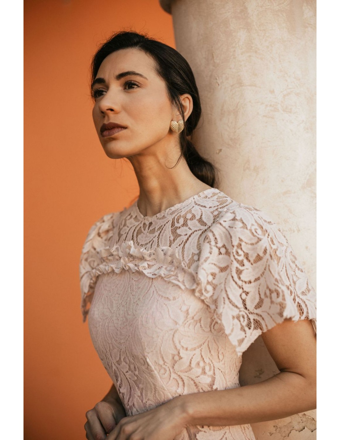 This pearl pink midi dress combines delicate lace with a romantic and sophisticated design. It features mini ruffles on the bodice and a wide ruffle at the hem for movement and style.