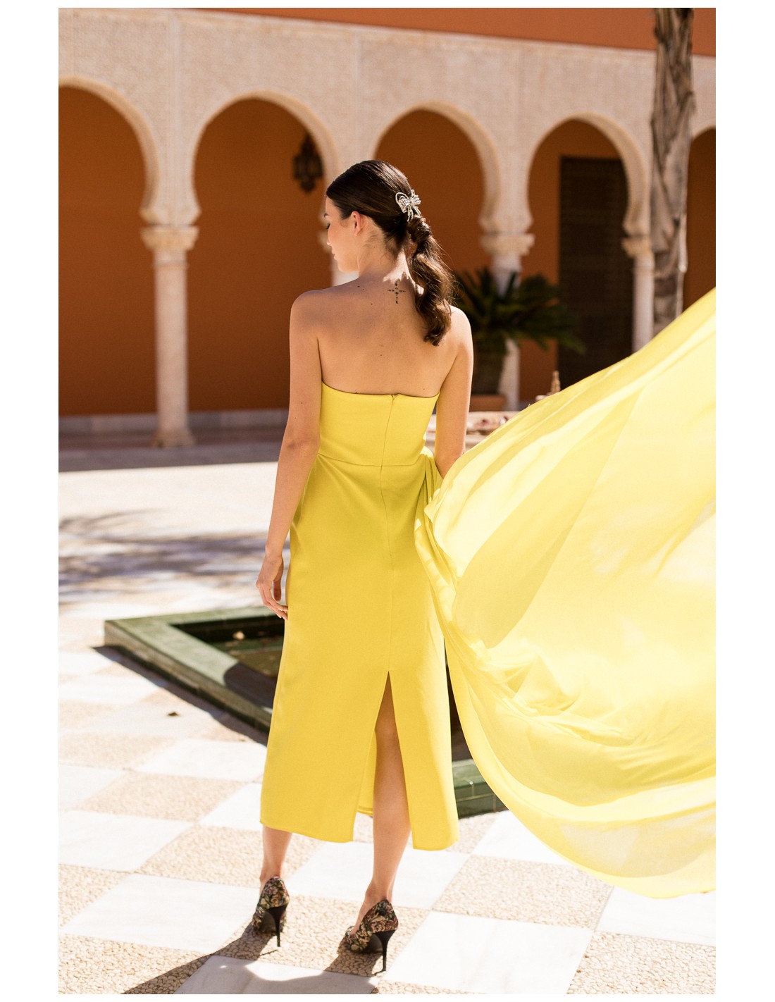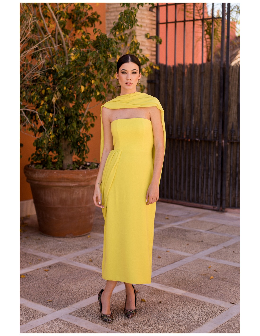 The yellow midi party dress is a versatile and sophisticated garment that allows you to create different looks and styles thanks to its design with chiffon in the same tone. Its intense lime color is fresh, luminous and very flattering, ideal to stand out in any event or celebration.