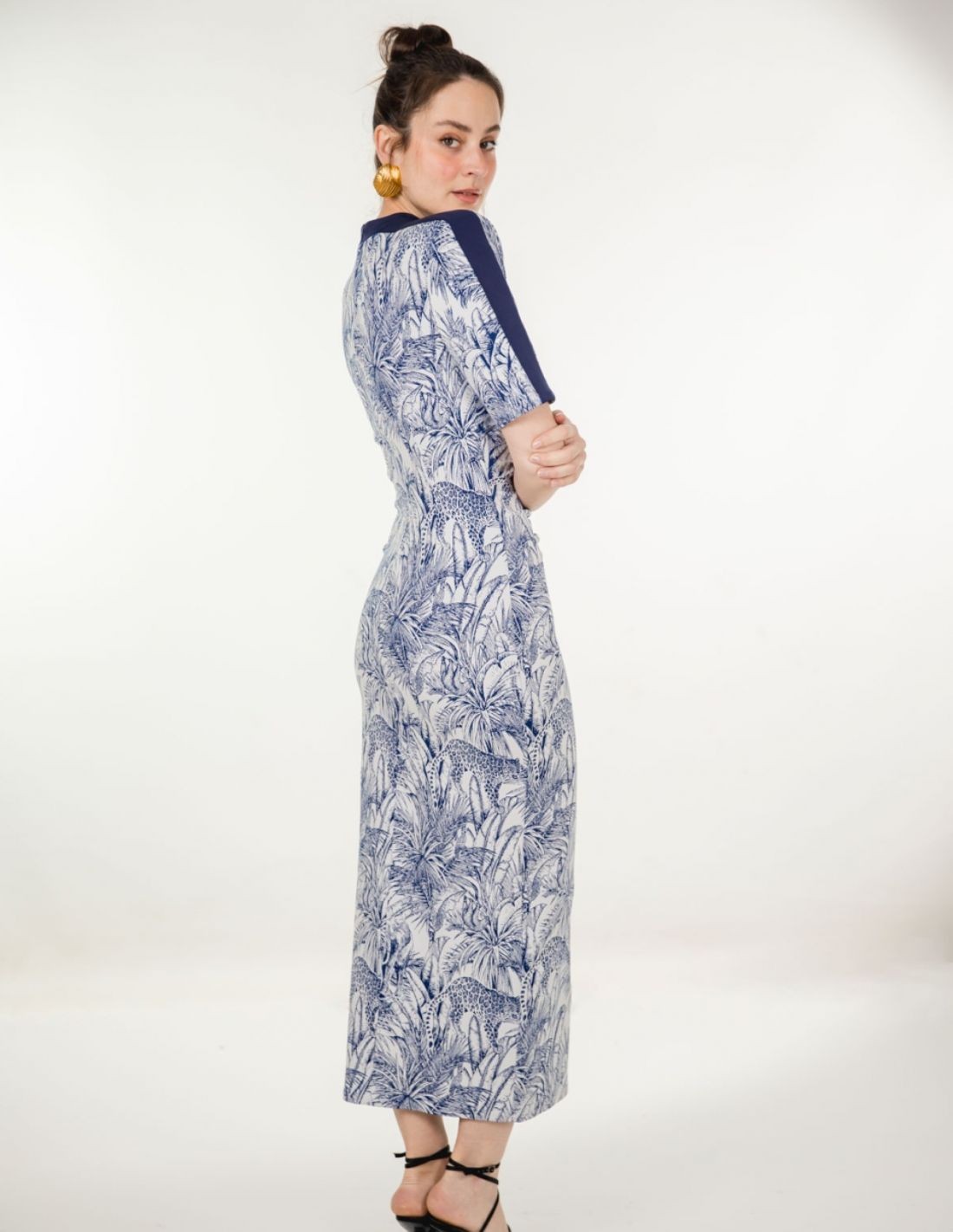 This neoprene knit midi dress with jungle print in blue tones is a daring and sophisticated piece that stands out for its originality. Its high neck, short sleeves with maxi shoulder pad and structured silhouette create a powerful look, ideal for women with personality.