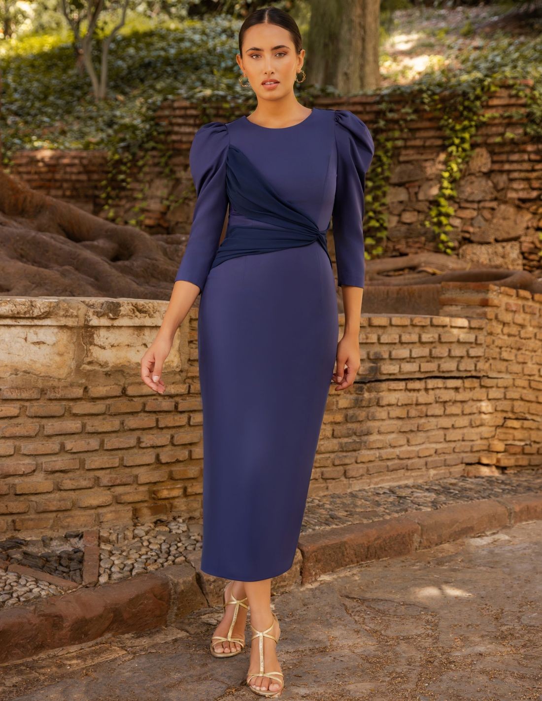 If you still don't have a look for your next event, this midi dress may be the ideal choice. A dress with midi cut design made of crepe and chiffon fabric in navy blue, with chiffon detail on the body and sleeves and with open back adding a jewel button detail at the bottom of the back. The ideal look if you want to make a difference in a special event like a wedding.