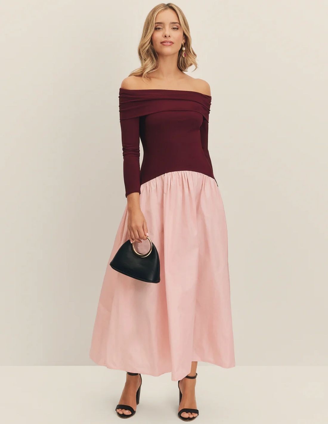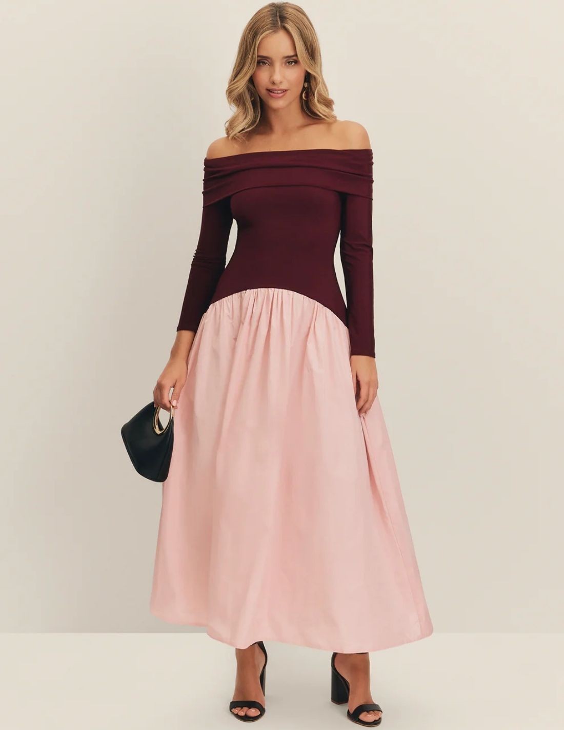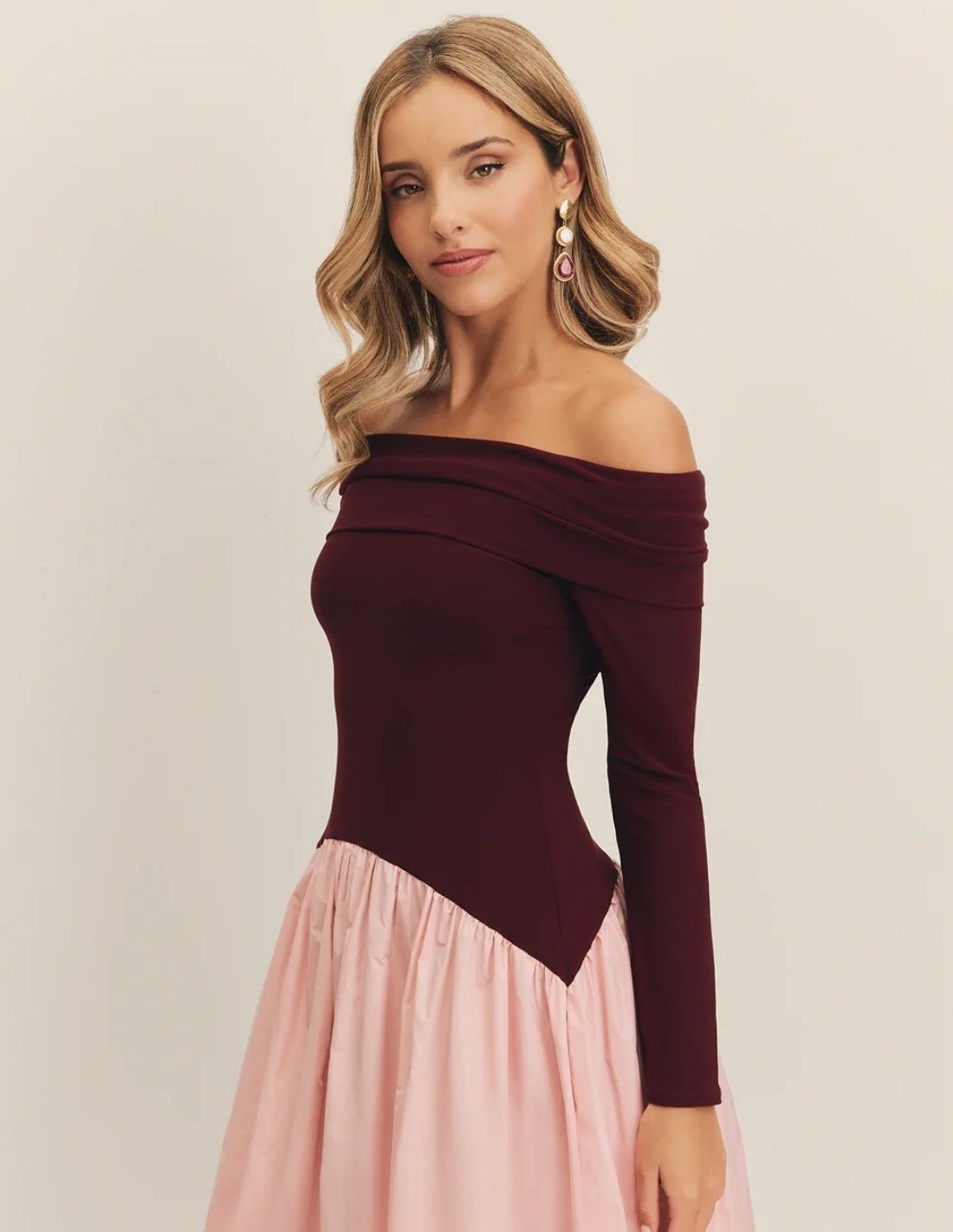 Eggplant and pink midi party dress with bardot neckline