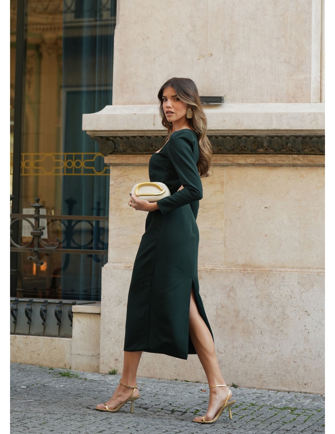 Dark green midi dress with square neckline and elegant long sleeves
