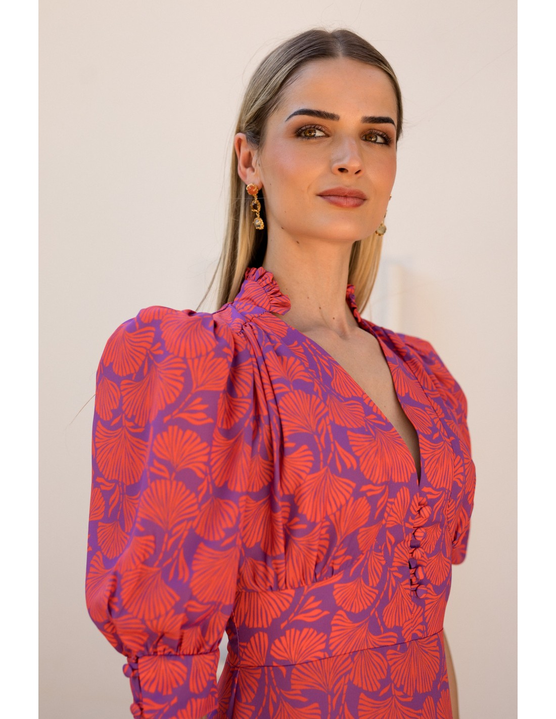 If you are looking for a special design for your spring events, this midi dress will make you fall in love. Made in fluid georgette with floral print in coral and lilac tones. It incorporates a V-neckline and short puffed sleeves that end in a cuff and with a pronounced shoulder pad, which makes it super flattering. The waist is fitted which allows an hourglass effect figure. Perfect for weddings, communion or baptism.