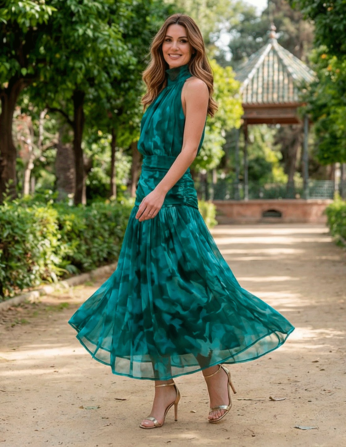 Elegant printed halter dress in green and blue tones for weddings and events in Spain, its midi cut makes it really versatile to wear it in an afternoon wedding as well as in a morning wedding or more informal event.