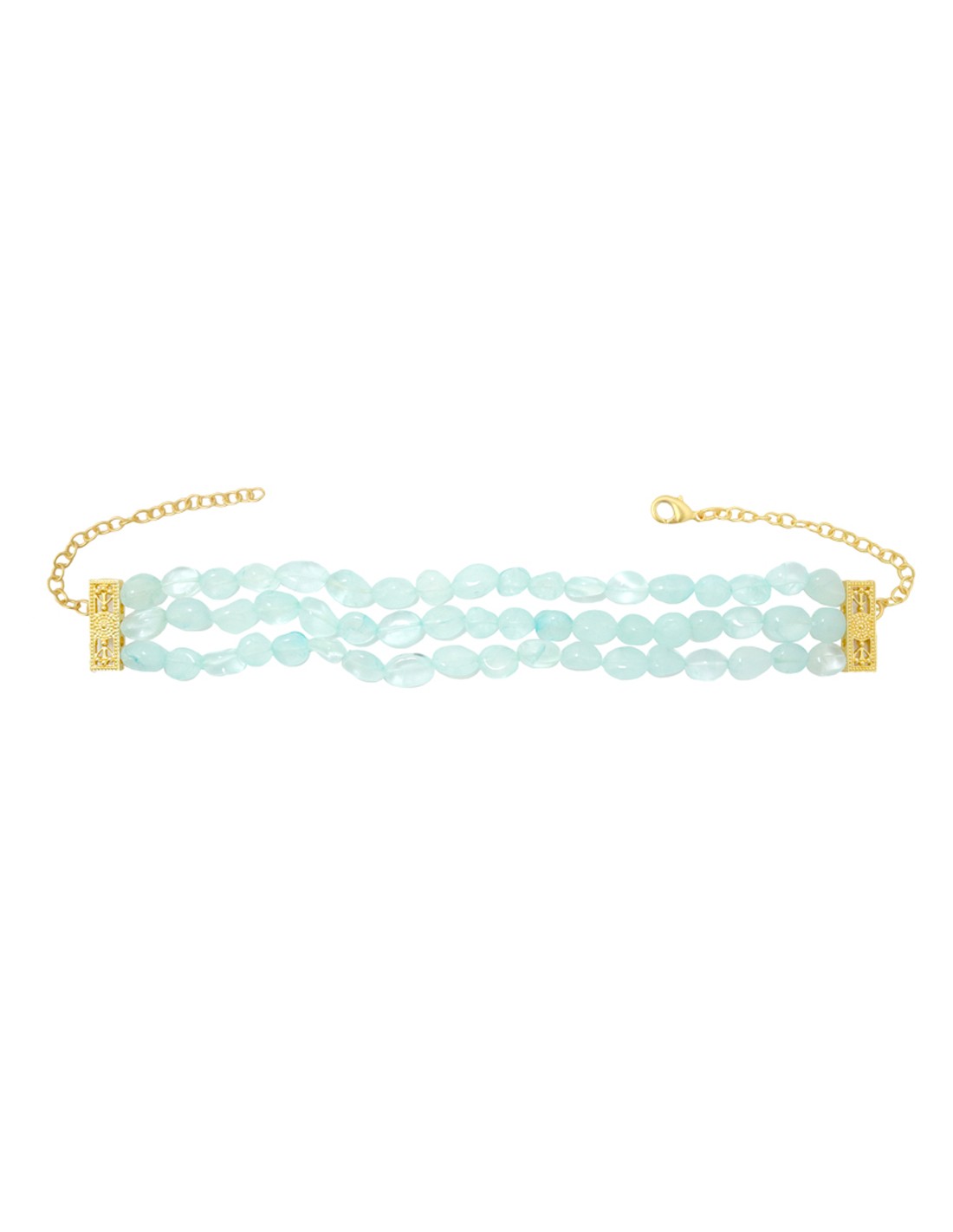 If you are a jewelry lover, this choker style necklace is a must in your jewelry box. It is an original, timeless and very versatile piece that you can wear with your most casual looks as well as for your special and more formal occasions. Thanks to its color, you can combine it with all kinds of clothes. It is made with three rows of natural stones in aqua green with a golden clasp.