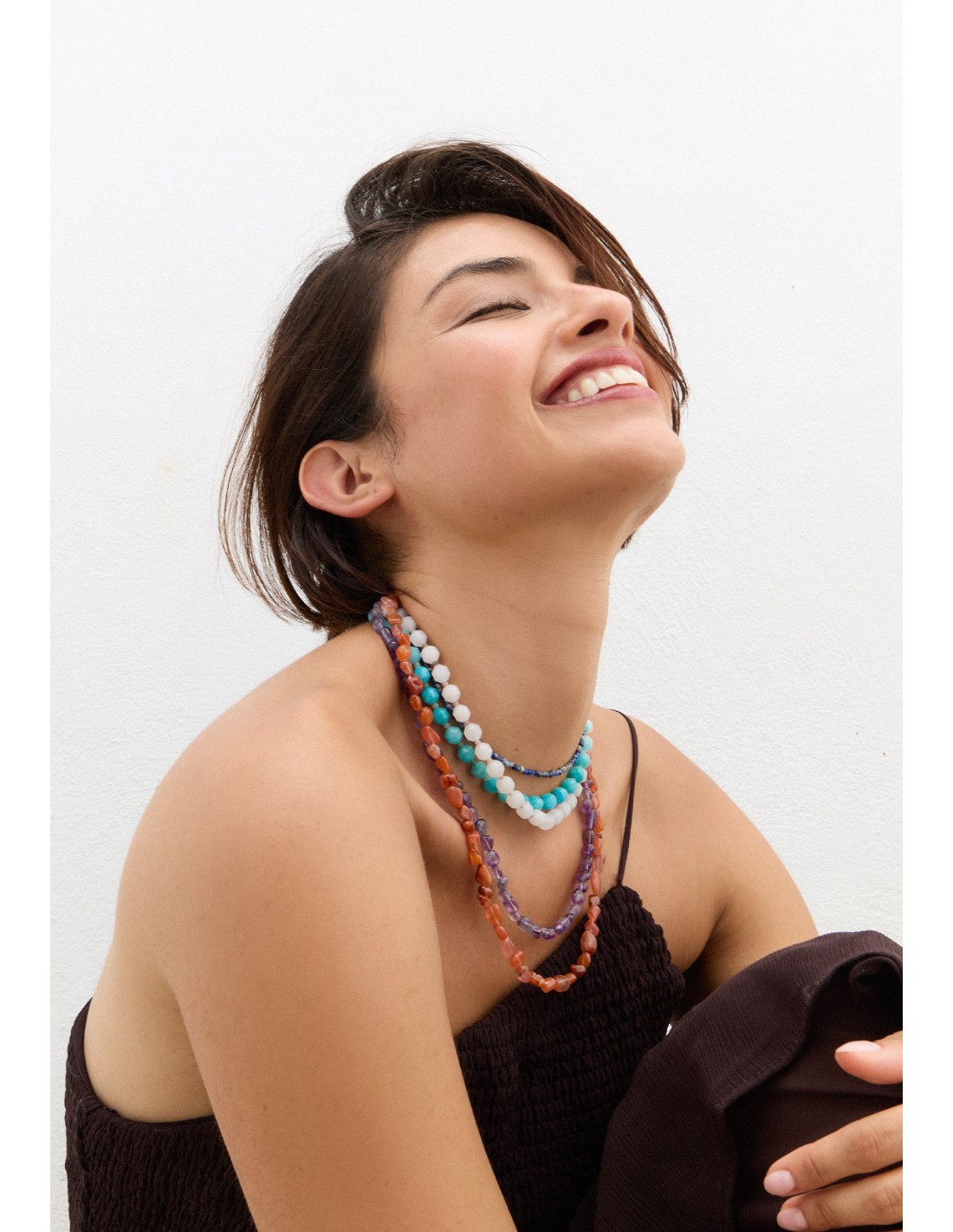 If you are one of those who bet on accessories that make you stand out and bring light to your look, this layered necklace is the ideal accessory for any occasion. A layered necklace made with semiprecious stones of different colors, with a 22k gold plated finish. Perfect to wear with your look for any special event.
