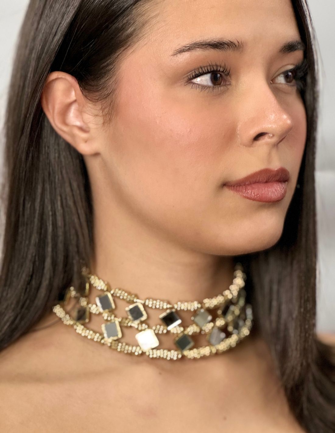 Add a touch of elegance and style to your look with our double wide mirrored choker, an ideal piece to elevate any dress or outfit to its highest level. Its double strap design elegantly highlights the neckline, while the small mirrors reflect subtle sparkles that add an original and sophisticated air. Perfect to combine with simple outfits and plain fabrics, ideal for any season, to give as a gift or even to combine with Christmas looks. Lightweight, adjustable and full of personality, this choker is the ideal accessory for those who love to stand out in style.