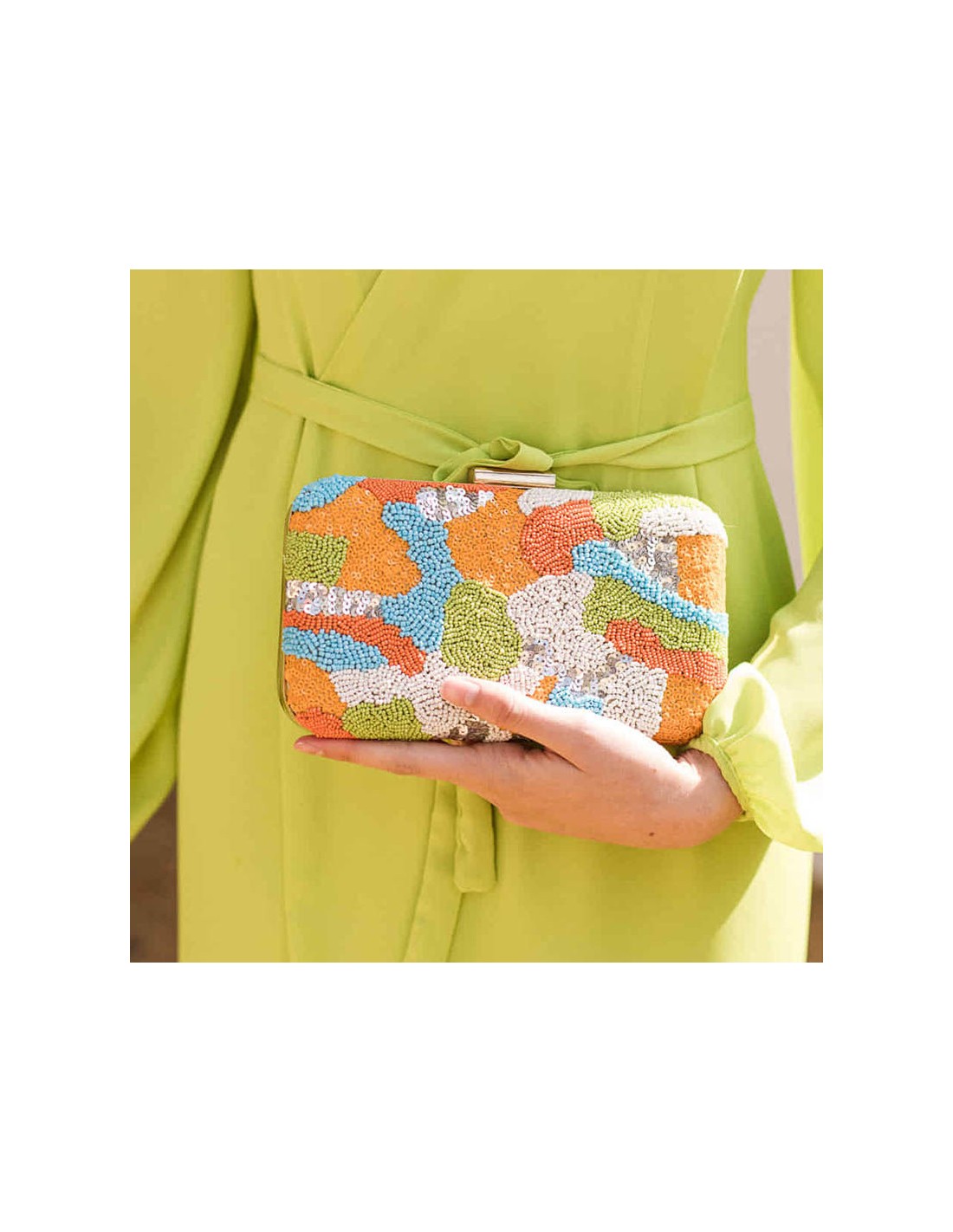 Add a touch of color and sophistication to your guest looks with this multicolored embroidered party clutch, a vibrant accessory with a lot of personality. Its blue, orange, silver and green tones combine perfectly to create an eye-catching and elegant design.