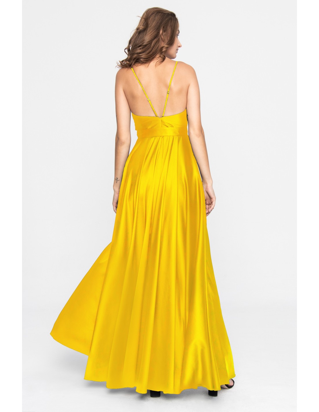 Long yellow satin dress with V-neckline and side slit