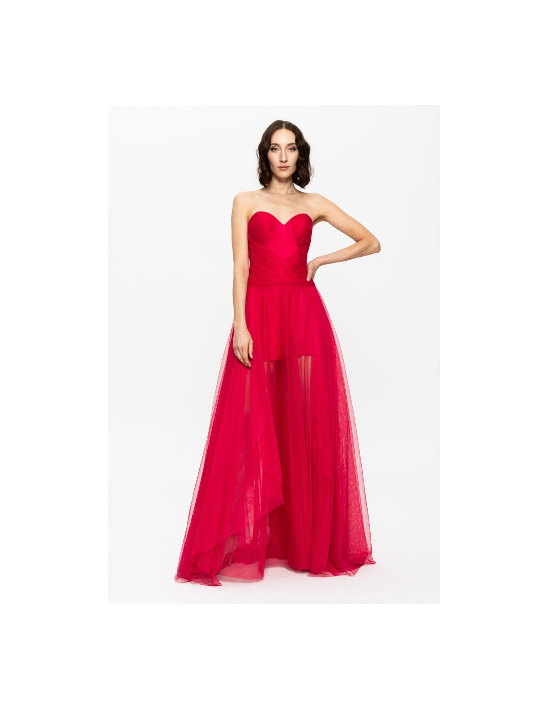 The short skirt base offers a youthful and daring style, perfect for showing off the legs in an elegant way. What really sets this dress apart are the long semi-transparent tulle handkerchiefs that fall from the waist to the floor. These tulle scarves add a dramatic and ethereal dimension, creating a lovely contrast between the short base of the skirt and the long layers that flow gracefully around the figure. The layers of semi-transparent tulle add movement and a touch of sensuality that elevates the design to another level.