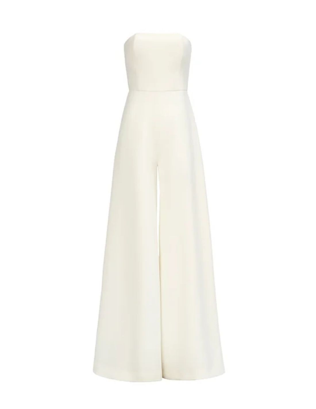 Long party jumpsuit with strapless neckline and palazzo trousers