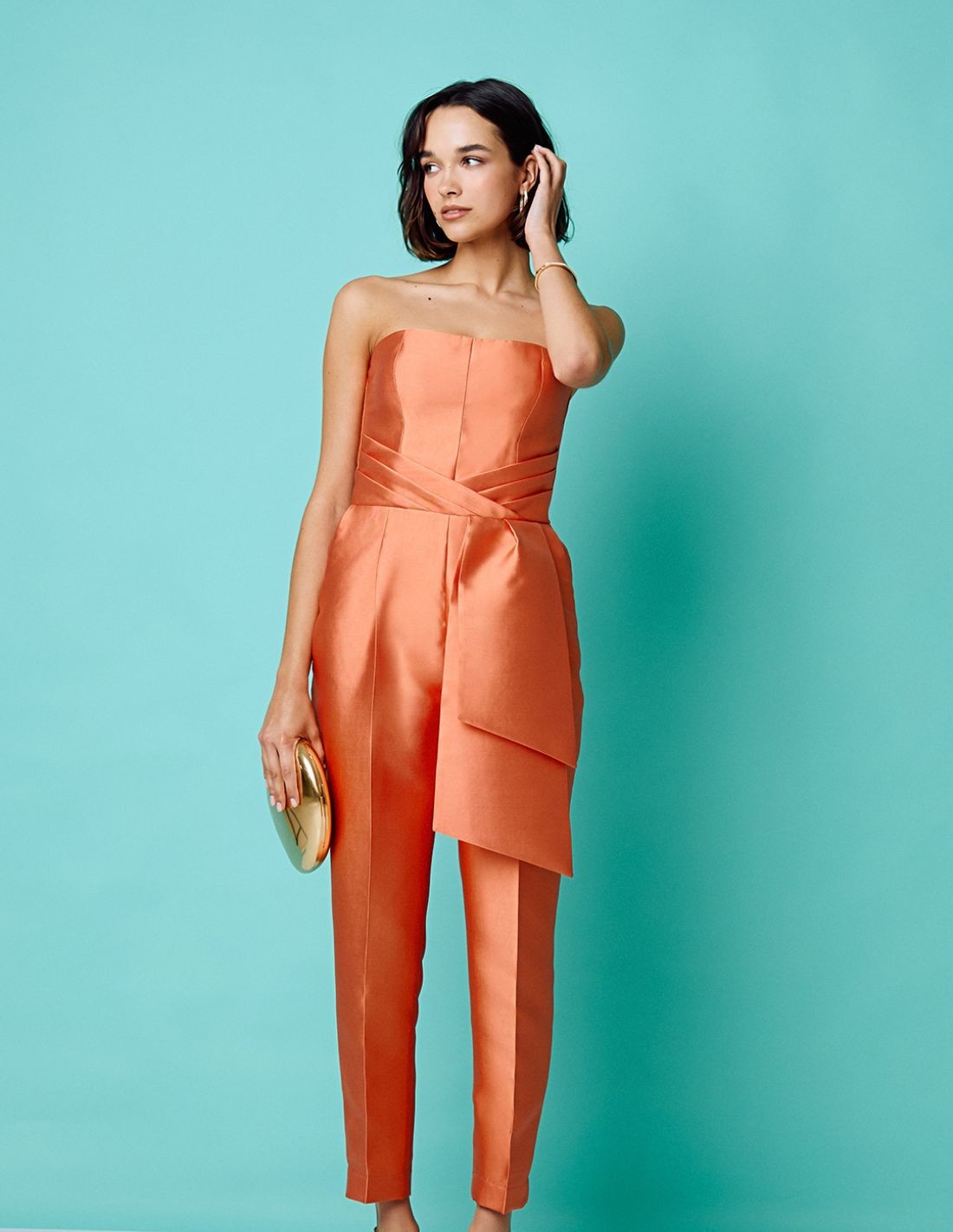 This peach party jumpsuit is a sophisticated choice for special events. Its strapless neckline includes built-in cups for added support, and the invisible back closure ensures a comfortable and perfect fit.