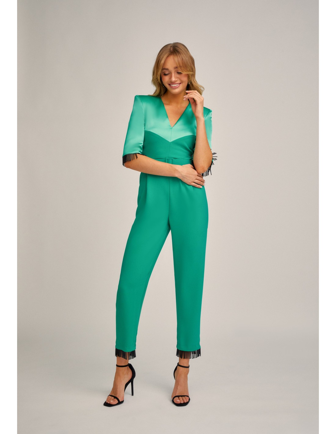The party jumpsuit in aqua green crepe satin is a sophisticated and elegant proposal for guests looking to stand out in style. Its V-neckline flatters the silhouette and slims the neckline, while the elbow-length sleeves add a refined and modern touch. The top includes a piece of the same fabric in shiny finish that enhances the design with a subtle contrast of textures.