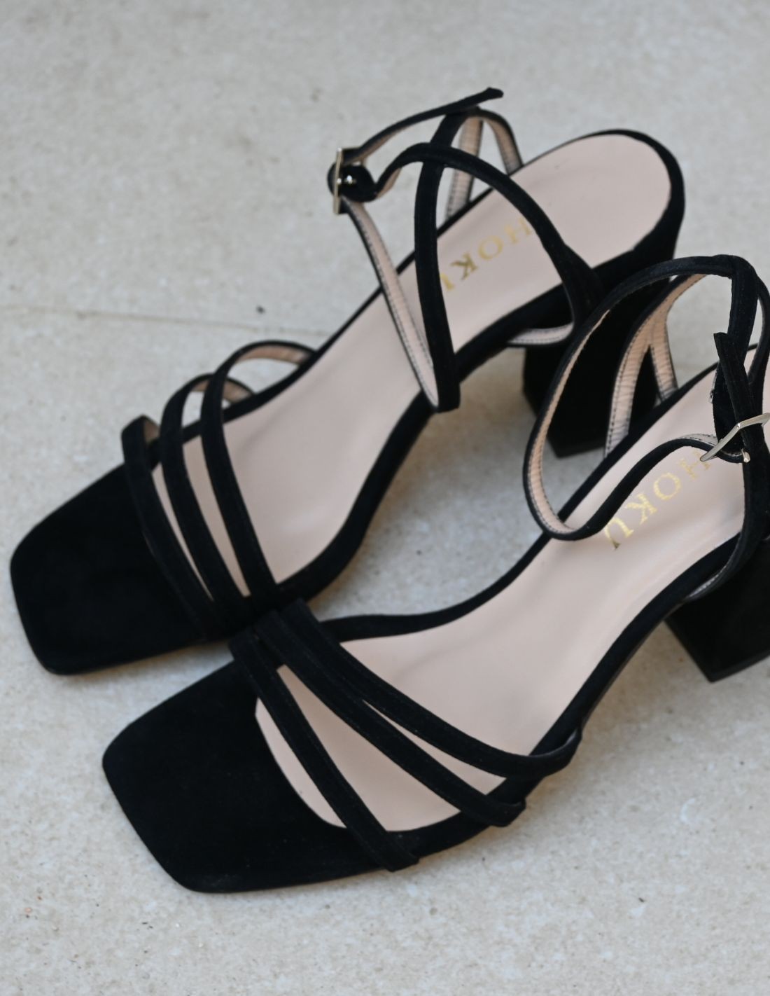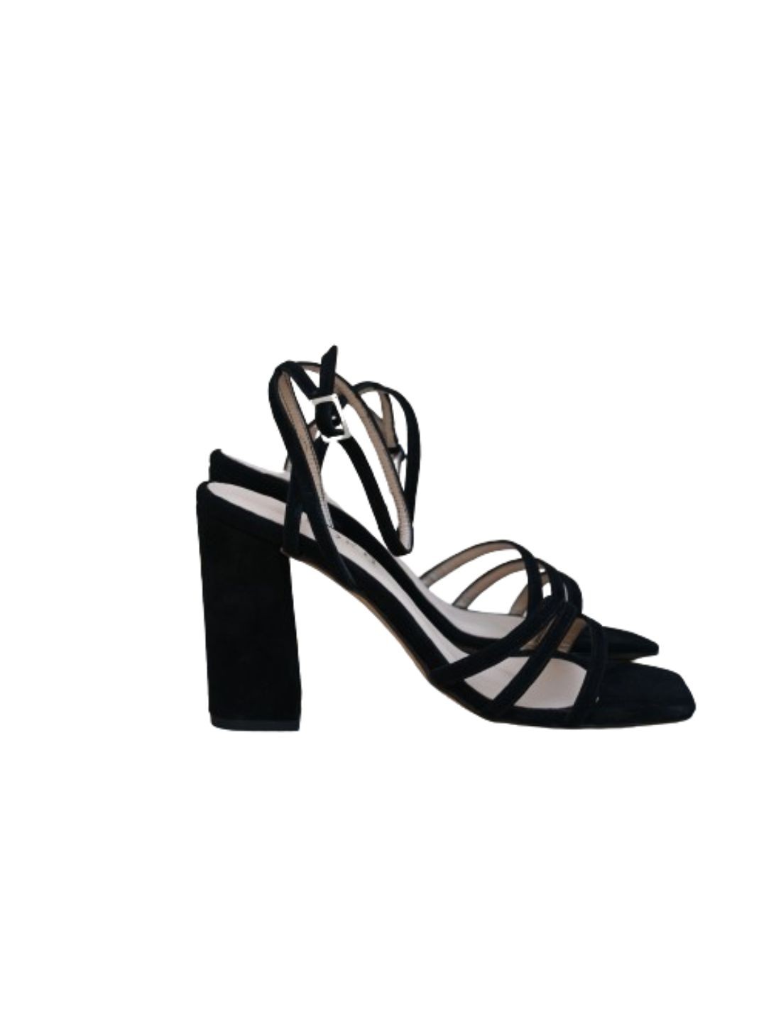 Black party sandal with suede square heel, in black color to wear in your most special occasions.