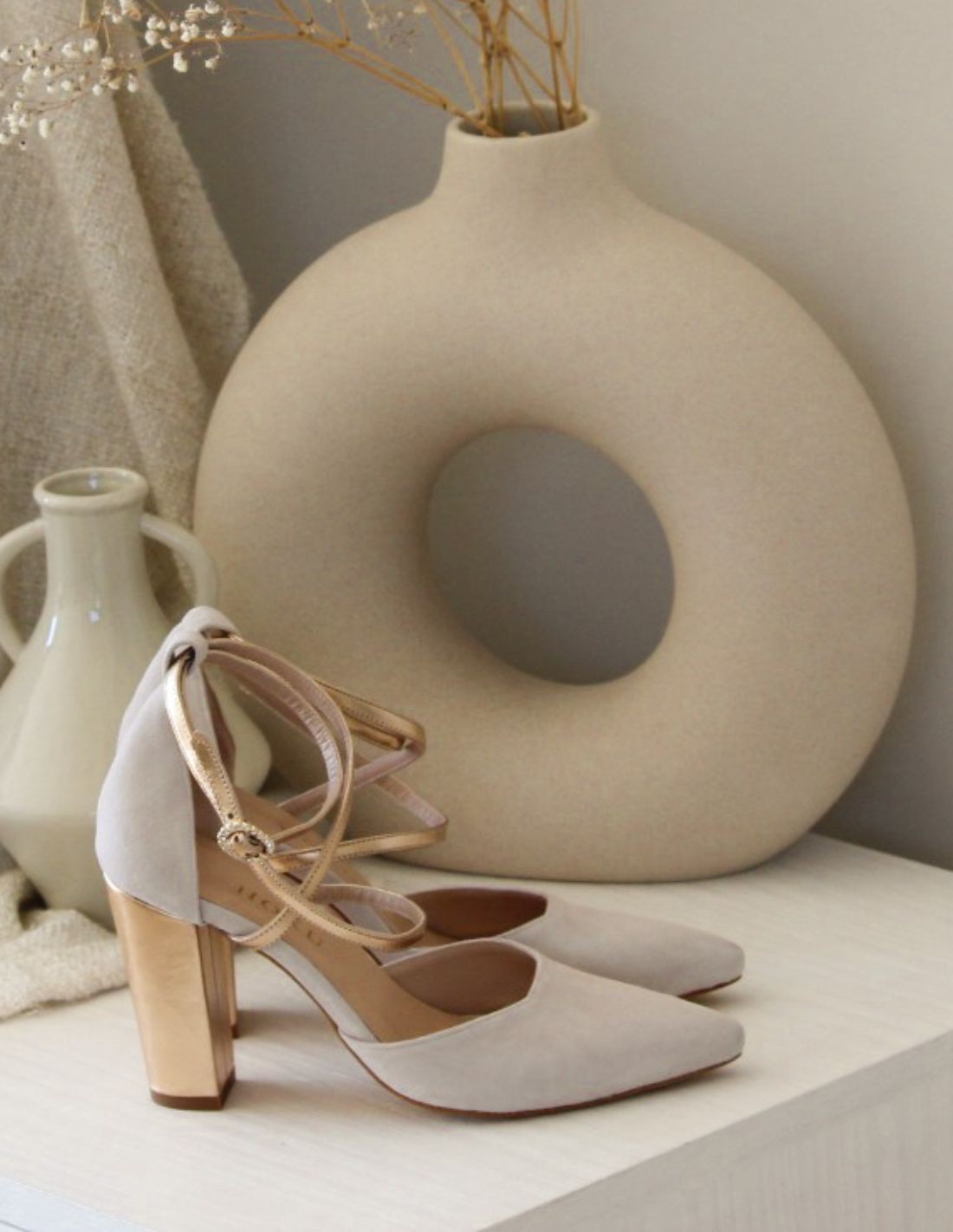 A comfortable and versatile shoe, it is perfect for guests, brides or bridesmaids. The contrast of beige and gold will give your look the elegant touch you were looking for.