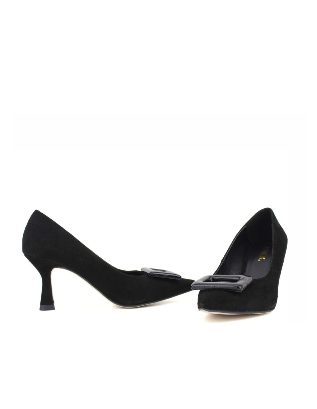 This black suede heeled pump with buckle detail features a classic and sophisticated design, ideal for formal or elegant occasions.