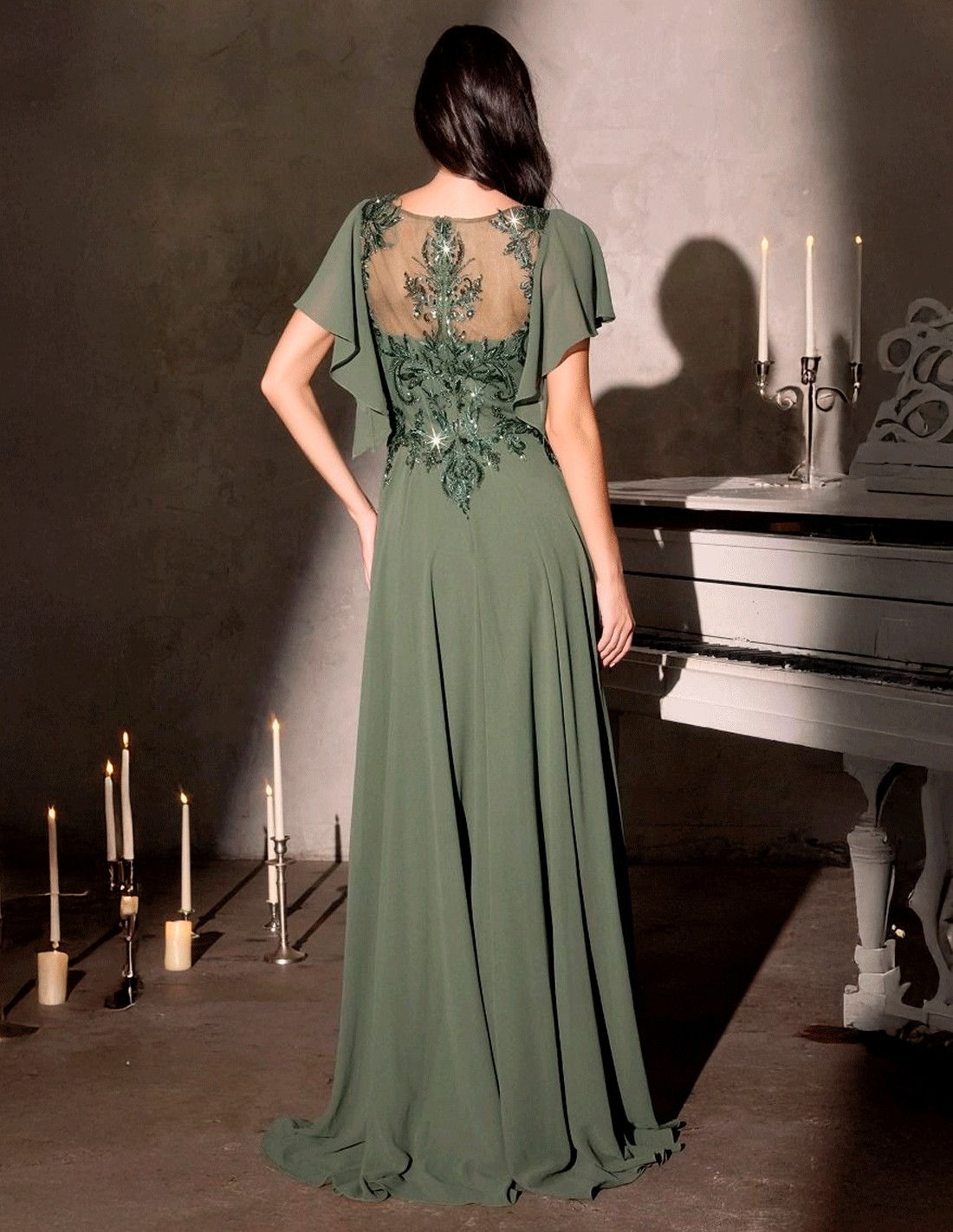 Long party dress with beaded bodice and cascading sleeves perfect for bridesmaids and elegant guests
