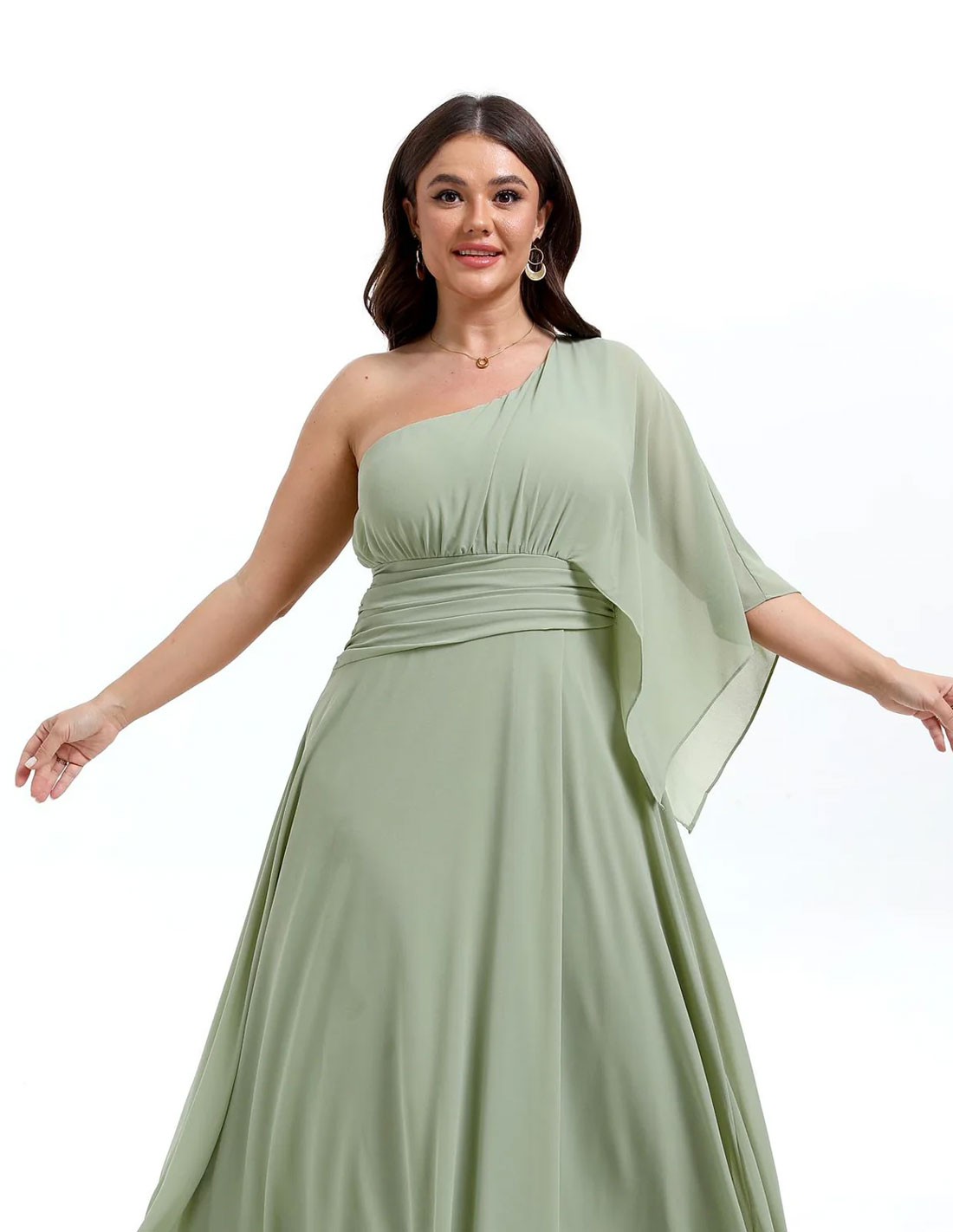 This stunning long party dress with asymmetrical neckline is specially designed to enhance and stylize plus size curves. With an elegant asymmetrical neckline, gathered waist and cape sleeves, it is the perfect combination of sophistication and comfort. Its full skirt with slit adds a touch of movement and sensuality, ideal for weddings, events and special occasions. Be the guest that dazzles at any celebration.