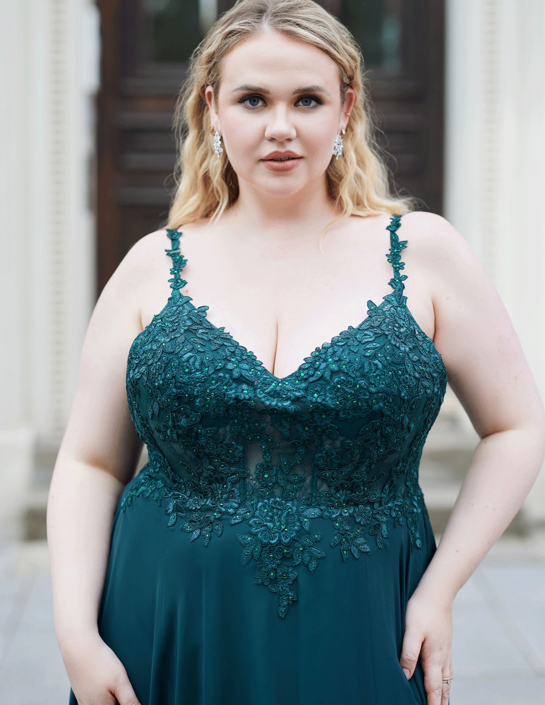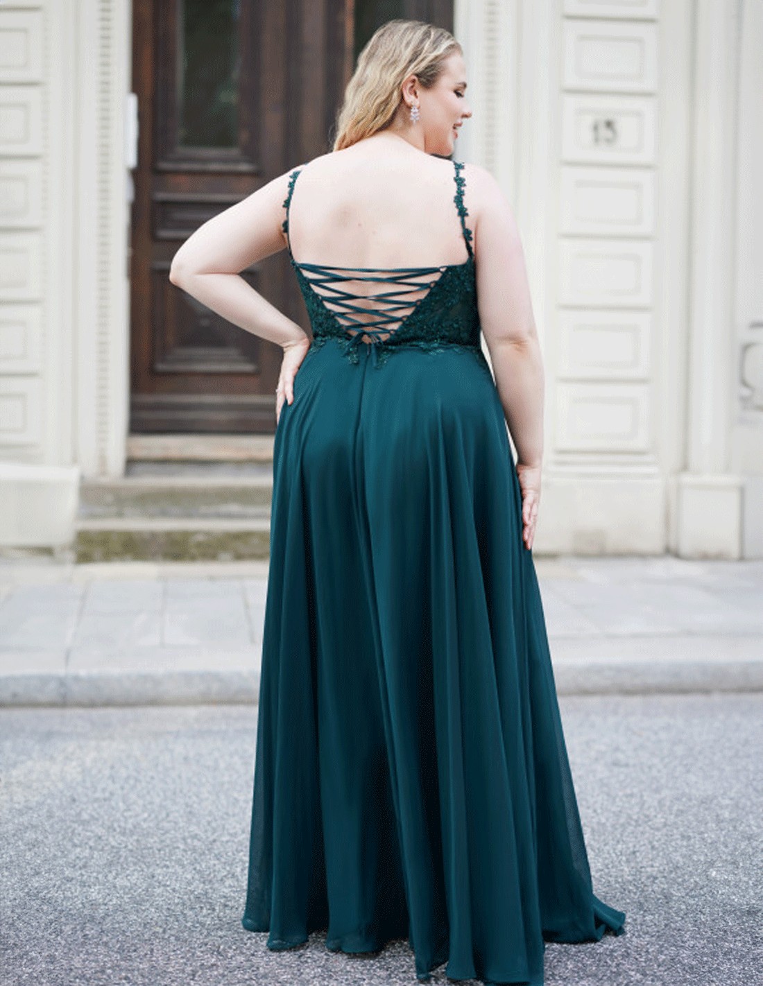 Discover plus-size elegance in this long party dress, handmade in Germany with delicate lace, a floaty chiffon skirt and a corset back for a perfect fit.