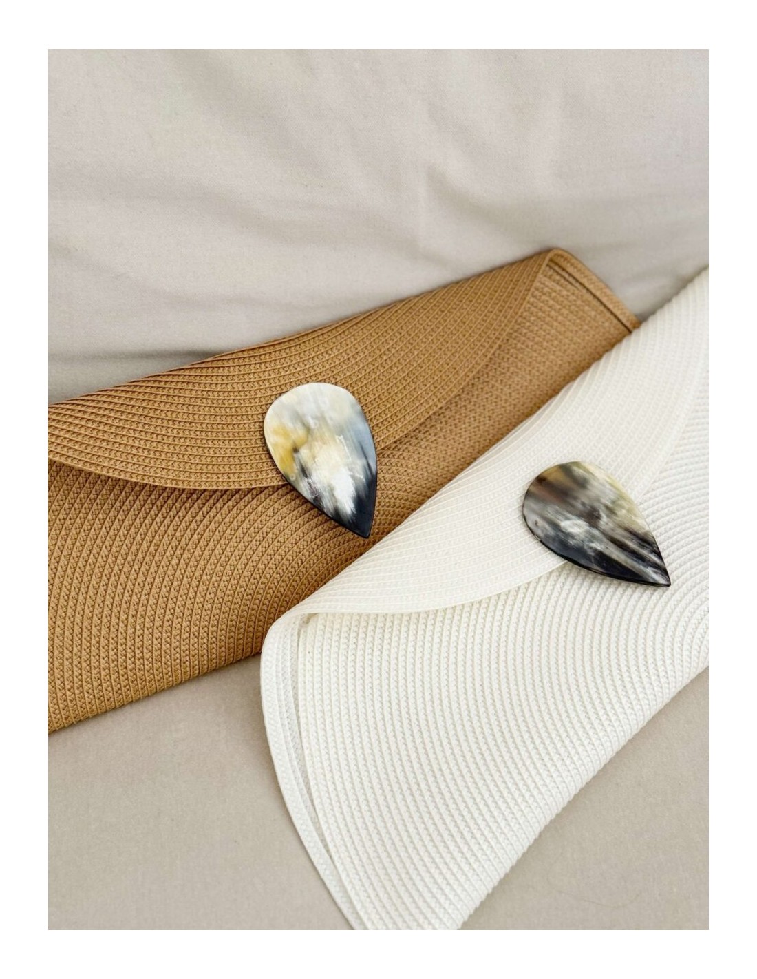 Each bag incorporates a teardrop-shaped African horn handle from Burkina Faso, which guarantees its exclusivity and beauty. Due to the uniqueness of the materials, each piece has variations in tone, carefully selected to harmonize with the raffia color chosen.