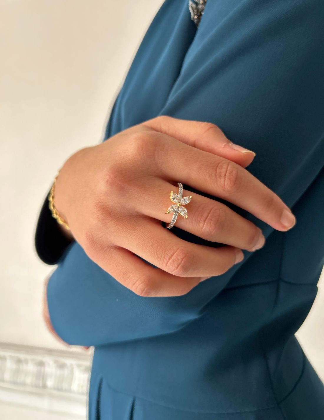 Adjustable flower ring with zircons