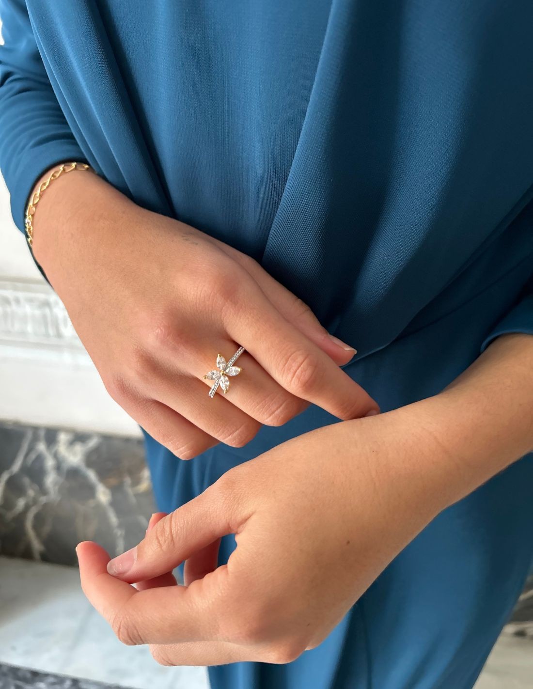 The flower ringwith zircons is a unique and special design, handcrafted, its timeless and adjustable design makes it an exclusive and comfortable piece that you can wear in your day to day.