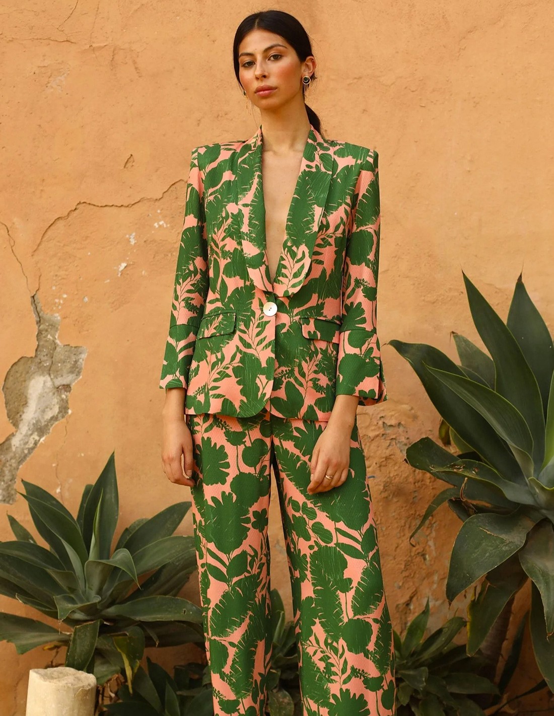 The perfect option for when you do not know what to wear or for all those who flee from the dress. The suit is the star garment with which to go perfect in any occasion. This design incorporates jacket with plunging neckline and button. Its pants are wide and straight. Its floral print is perfect for the season.
