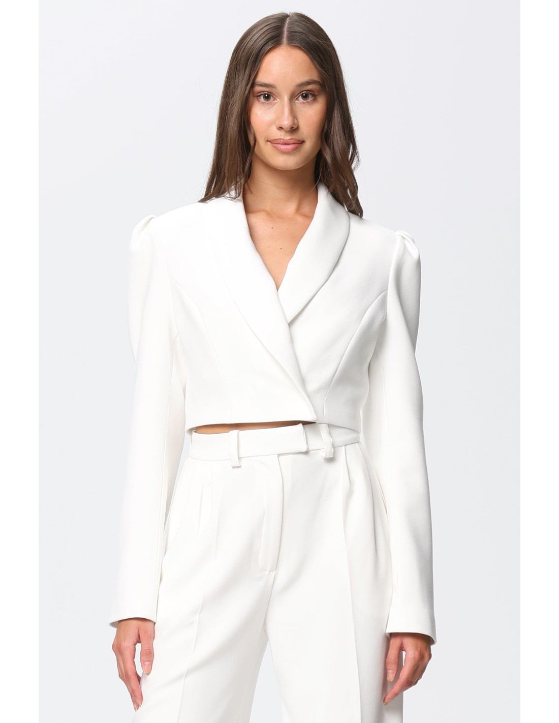 This structured, long-sleeved white short blazer is a smart and sophisticated piece, ideal for formal occasions or special events. Crafted in a structured design with a slim fit, it features a cropped length that ends just above the waist for a modern, streamlined look. The jacket has long sleeves and a wide lapel collar for a formal look. Discreet shoulder pads add volume to the top, creating a feminine silhouette.