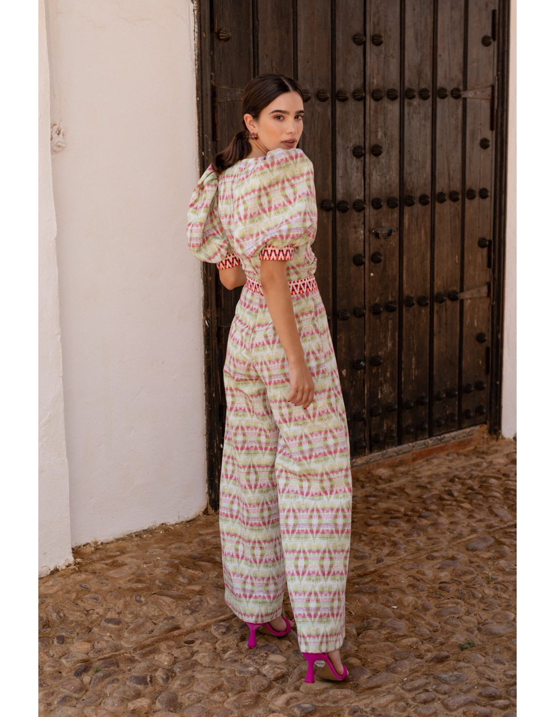 The high-waist, straight-cut pants are perfect for elongating the figure, providing a fluid and light drape that guarantees comfort and movement. Its jacquard fabric with ethnic print adds an exclusive and original touch, ideal for special events or daytime looks with a distinguished air.