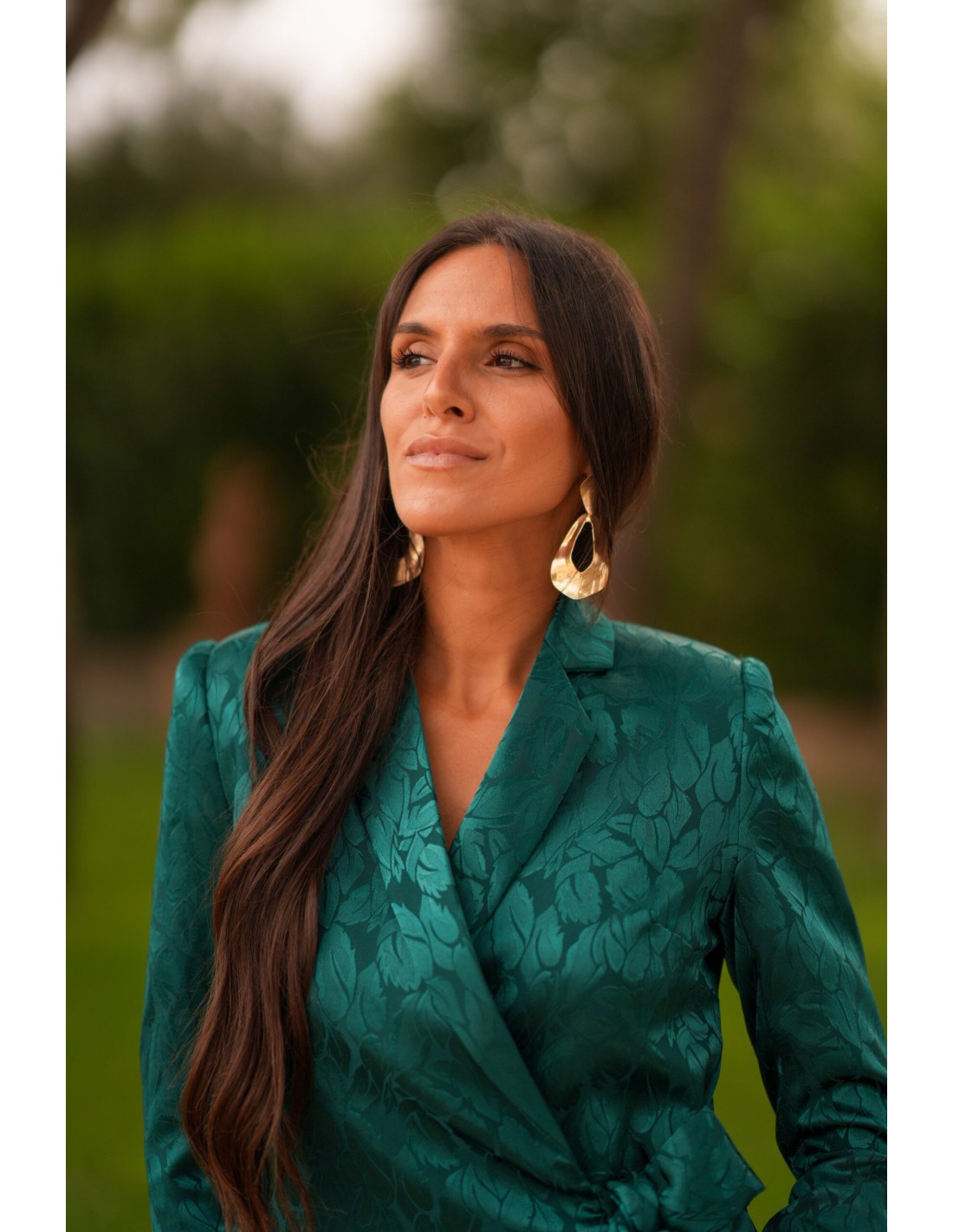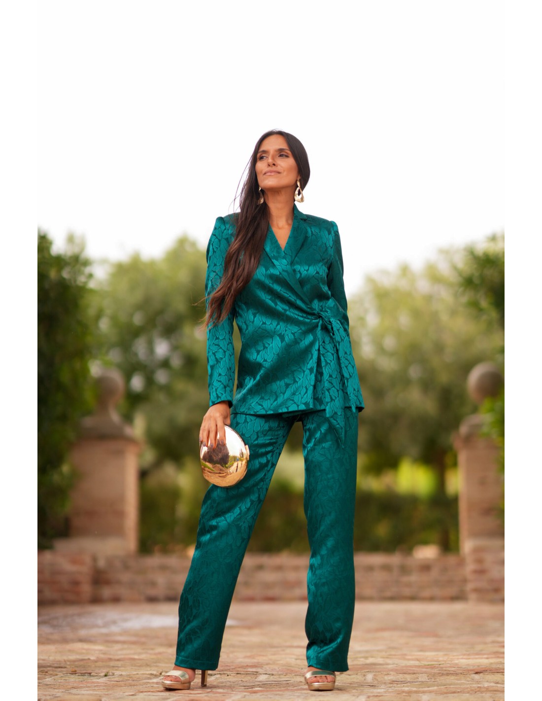 This set of jacket and pants in satin fabric is a sophisticated and modern option for special occasions. The jacket, with a crossover cut and V-neckline, is elegantly fitted with a side tie, highlighting the feminine figure. The straight-cut pants, made from soft satin with green brocade, add a refined and flattering finish.