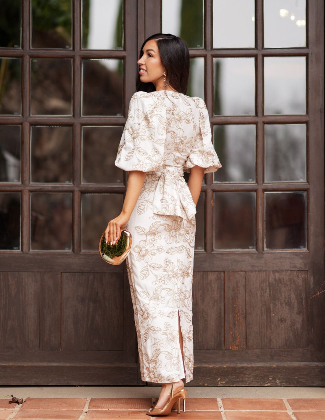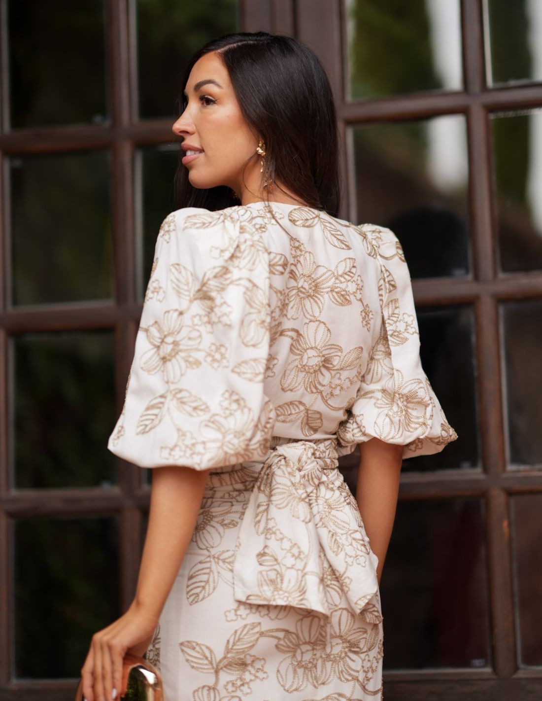 Two-piece set of blouse and skirt in chiffon in beige tones, elegant and comfortable. The blouse stands out for its V-neckline, puffed sleeves and the lacing that can be placed in front or back according to your style. The high-waist skirt includes a small slit in the back that facilitates movement.