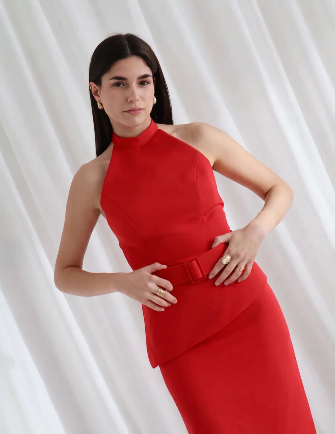 Two-piece set in red consisting of halter neckline top, straight skirt with back slit and matching belt.